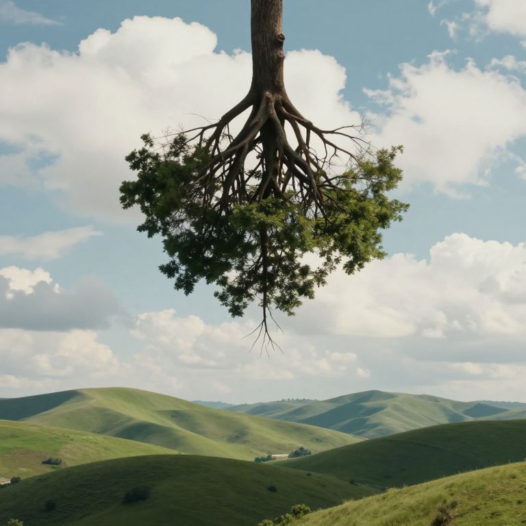 A surreal digital artwork depicts an inverted tree with its roots extending downward into the sky, defying gravity against a backdrop of fluffy white clouds and rolling green hills, creating a dreamlike, otherworldly landscape.