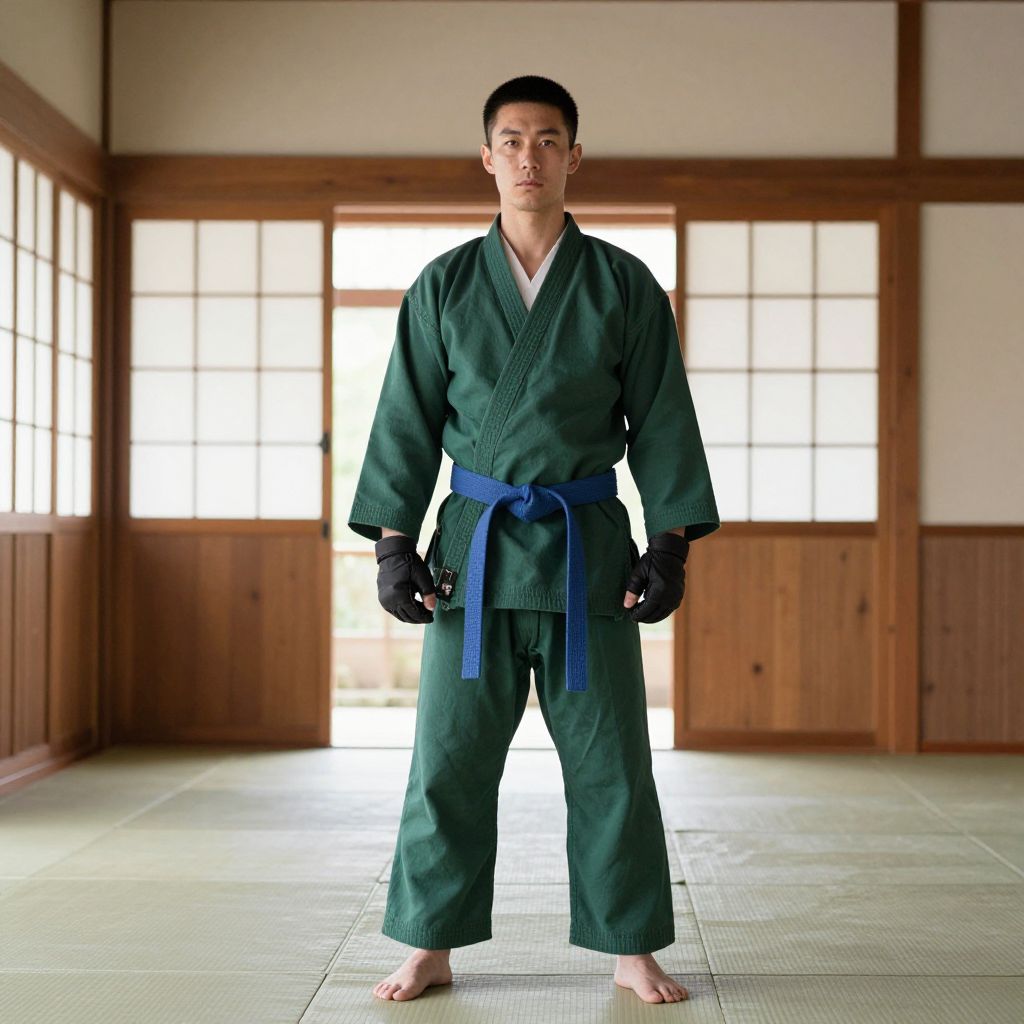 A man in a green karate uniform with a blue belt stands confidently in a quiet dojo, his posture straight and focused, wearing traditional karate gear with a white undershirt and black gloves. He has short, neatly trimmed black hair, a calm expression, and a quiet intensity in his eyes, reflecting dedication and discipline. The setting is a peaceful, well-maintained training hall with soft natural light filtering through wooden doors, adding warmth and depth to the scene.