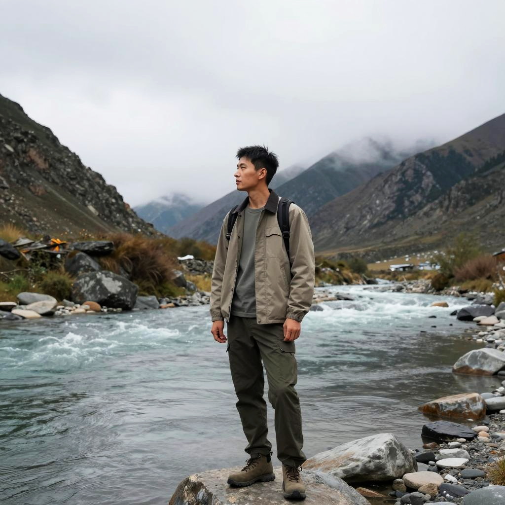 A man stands by a serene river, surrounded by a rugged mountainous landscape under a clouded sky. He is dressed in a casual, outdoor style, suitable for exploring nature's beauty.