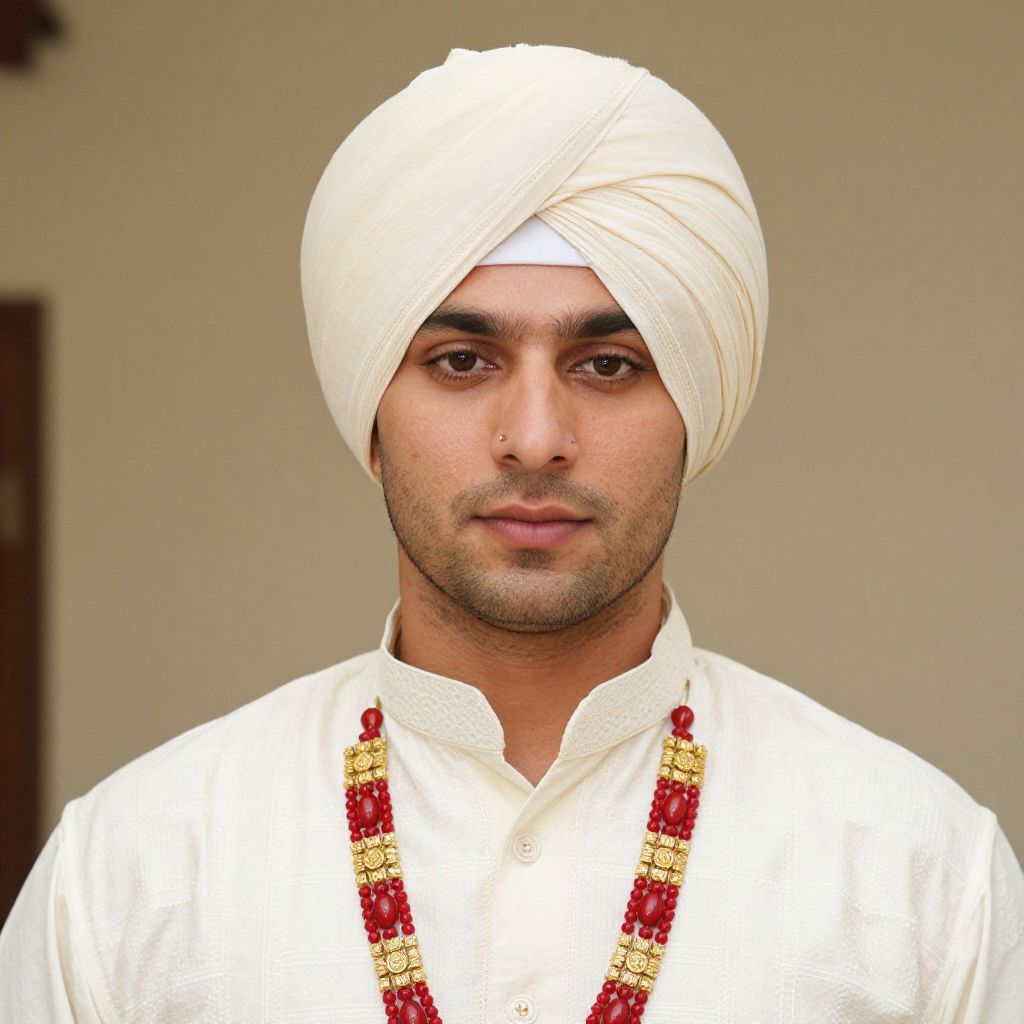 Punjabi Outfit Male Costume, a close up of a man in a turban and a red and gold necklace