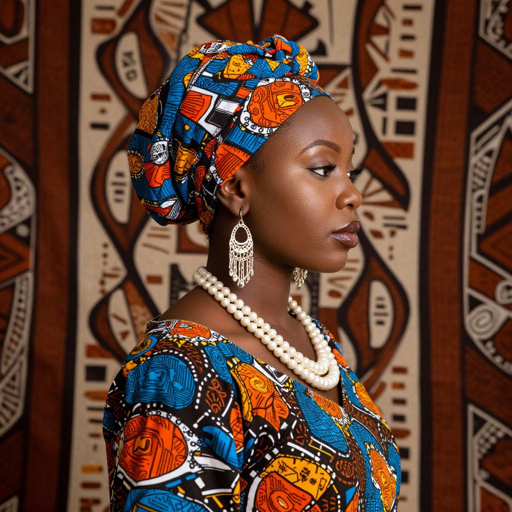 Photograph of a dark-skinned woman in vibrant, colorful African attire with intricate patterns, wearing a matching headwrap, pearl necklace, and large silver