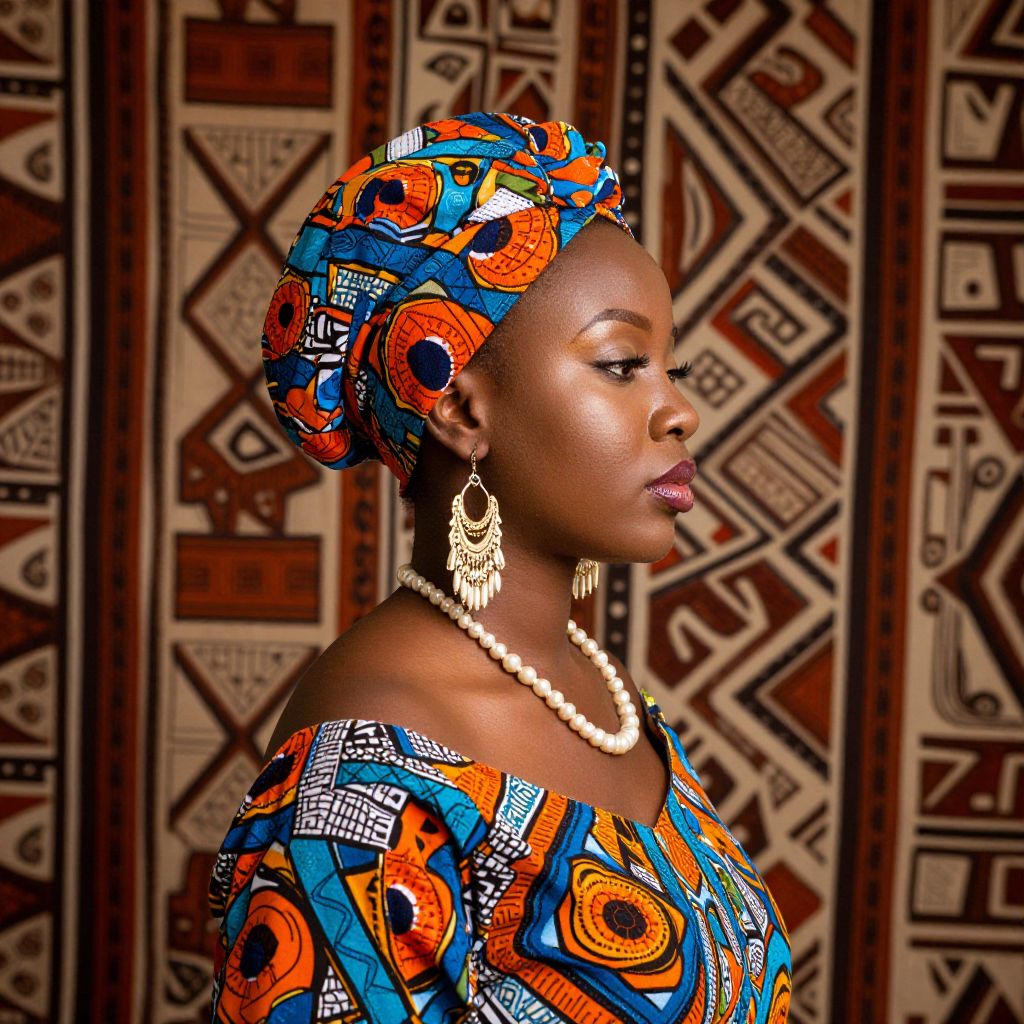 Profile view of a beautiful Black woman adorned with vibrant African patterns, featuring a colorful headwrap, dangling earrings, and a pearl necklace against a geometrically intricate tribal background.