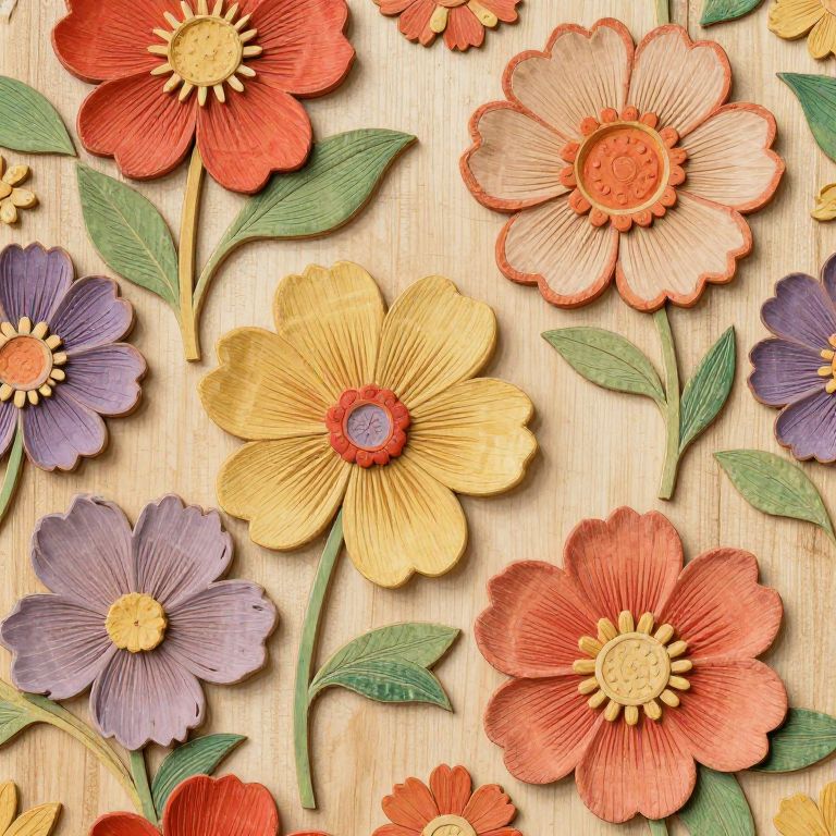 Wood Carving flowers, seamless pattern, romantic, in the style of Miho Hirano, nostalgic, ethereal, extremely colorful, 1960s photography vibe,