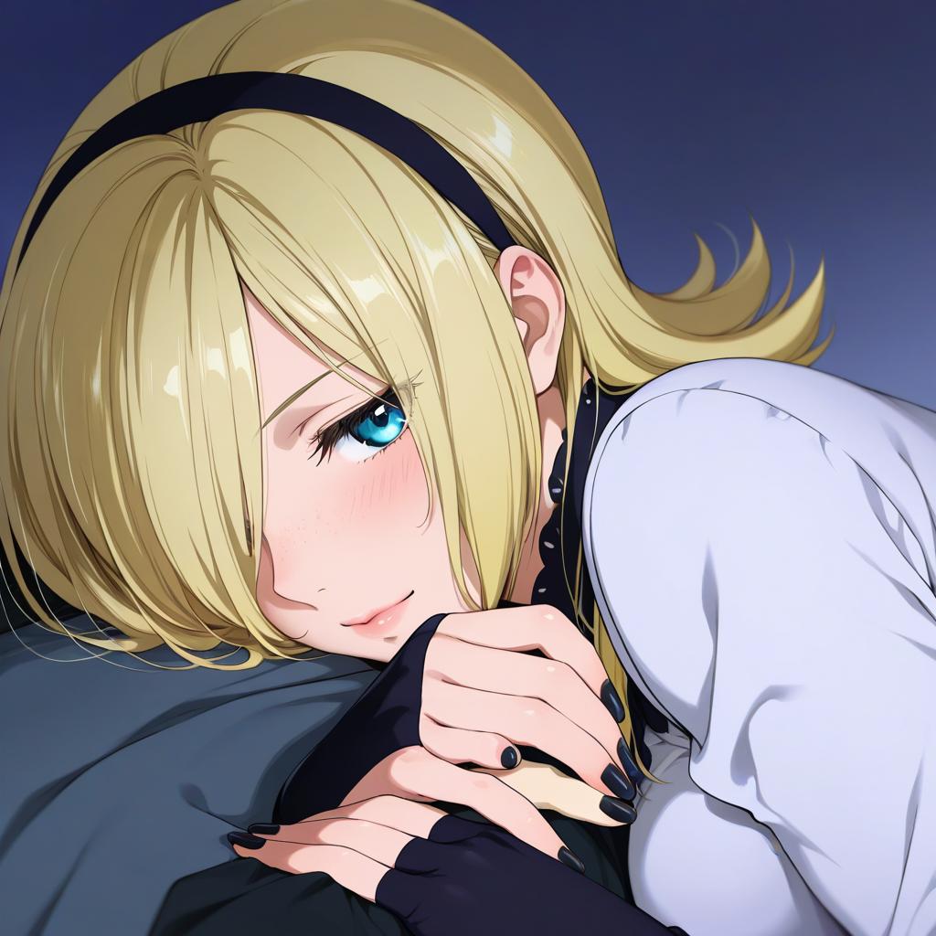 Ash crimson, the king of fighters, 1boy, blue eyes, hair over one eye, blonde hair, hairband, freckles, fingerless gloves, nail polish, black nails, by artist horiguchi yukiko, illustrious
