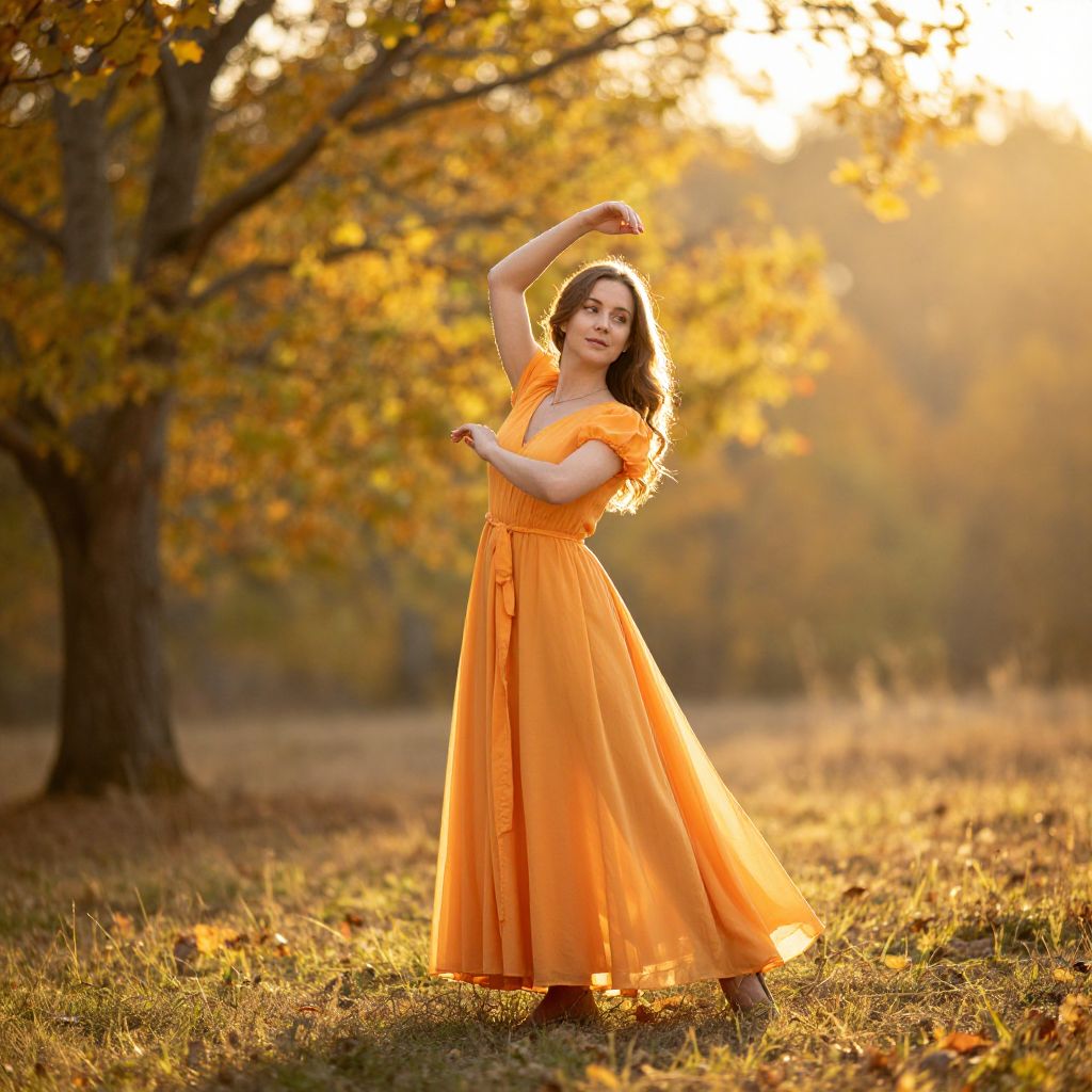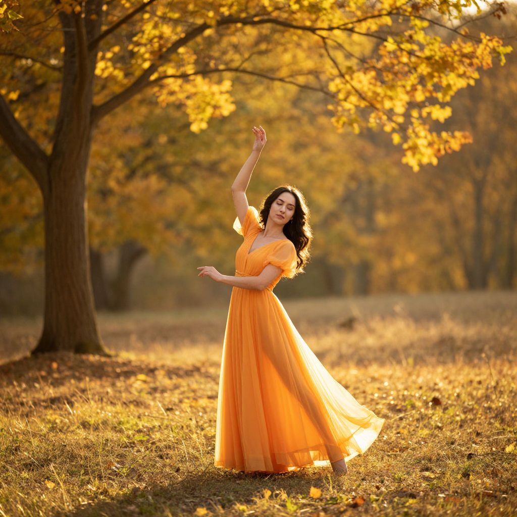 A woman in a flowing orange dress stands gracefully amidst a vibrant autumn landscape, bathed in the warm, golden light of the sun, creating a serene and picturesque scene that evokes the essence of natural beauty and seasonal charm.