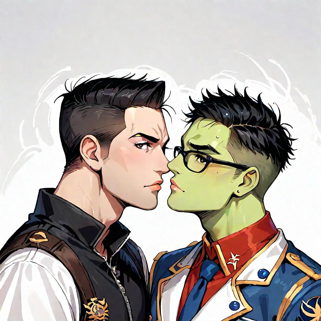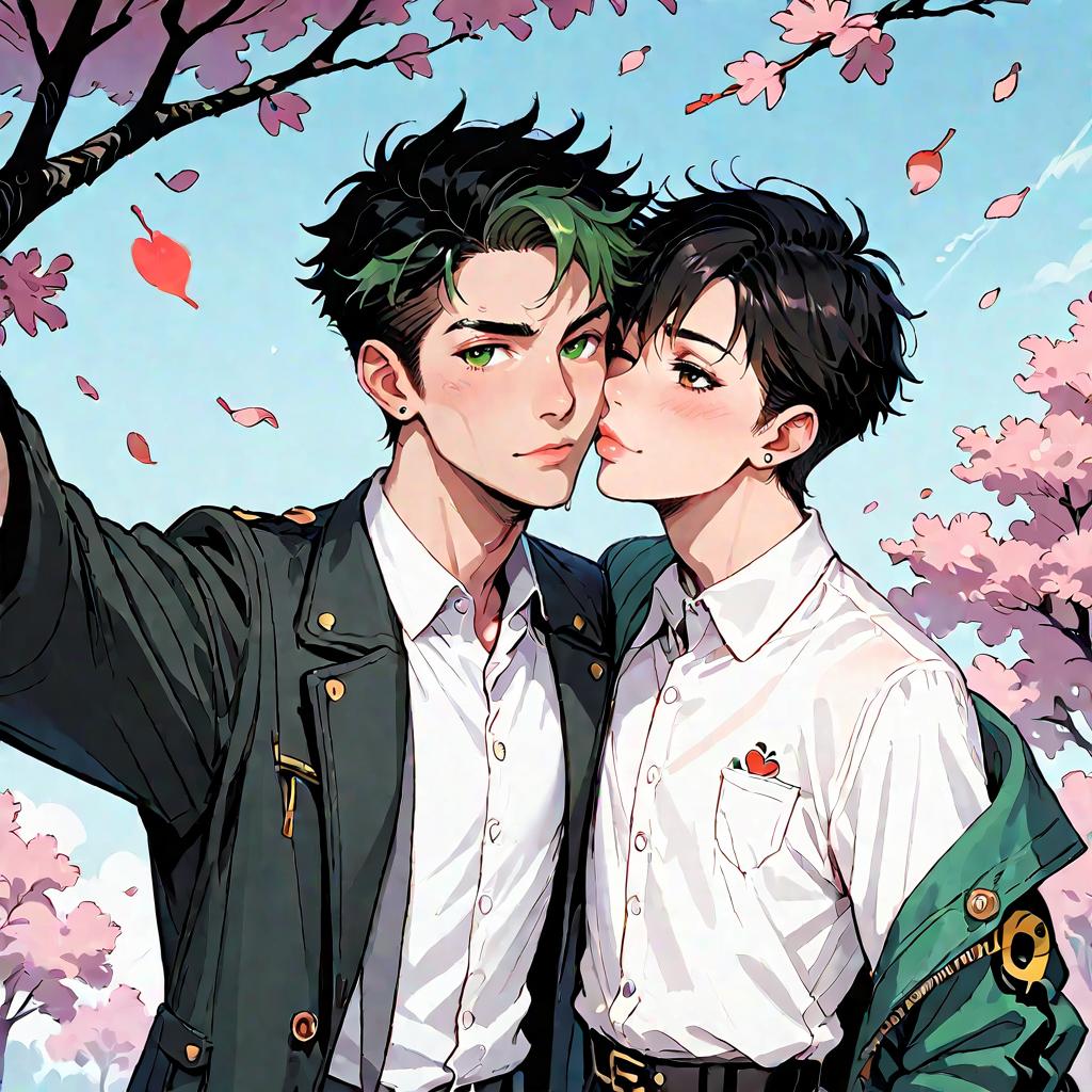 Selfie, 2boys, hearts, falling leaves, falling petals, tendouakira, white shirt, green jacket, open jacket, andkosugigonzou, black jacket, score_9, score_8_up, score_7_up, score_6_up, anime