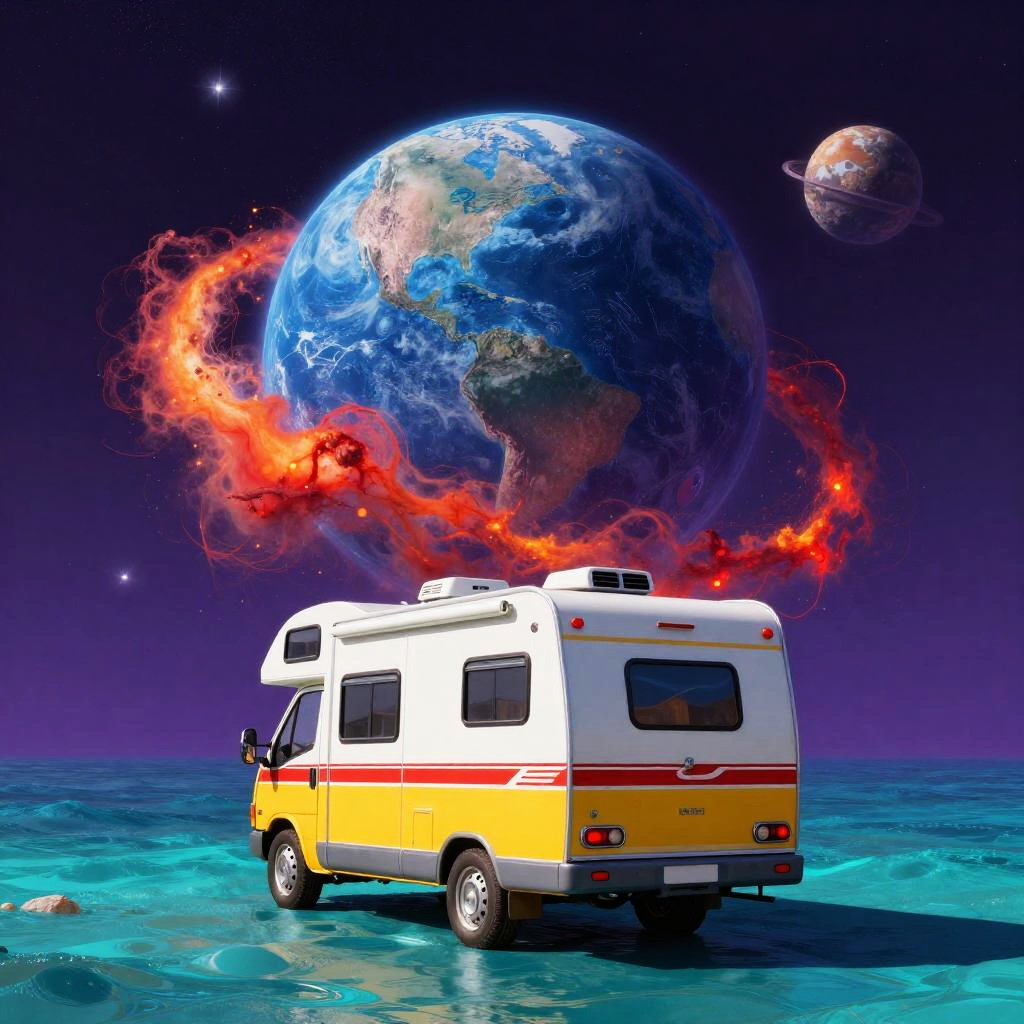 This is a digital artwork of a psychedelic, cosmic scene. A yellow and white RV with red stripes is parked on a turquoise ocean, facing away from the viewer. Behind it, a colorful nebula glows in red and orange hues. A large, blue planet with craters looms in the starry, dark purple sky. A smaller, rocky planet is visible in the upper right. The overall style is vibrant and surreal.