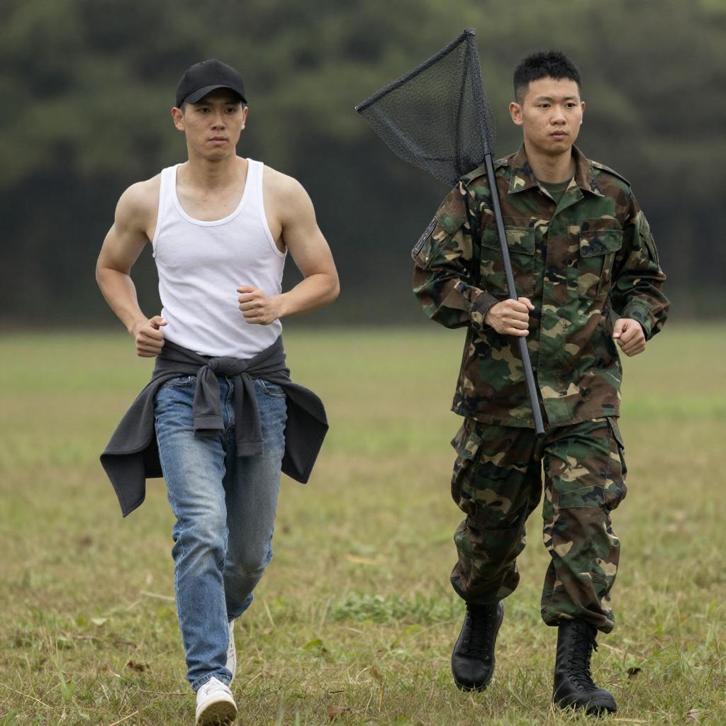 Photograph of two men running in a grassy field. The man on the left, wearing a black cap, white tank top, and blue jeans with a gray jacket around his waist, has a muscular build. The man on the right, in a camouflage uniform, holds a net. Both have determined expressions. Trees are in the background.