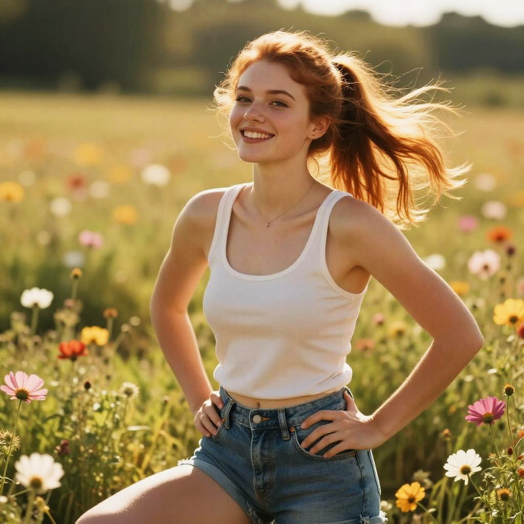 (masterpiece:1.1), best quality, (photorealistic:1.2), hyperrealistic, award-winning portrait of young woman, auburn ponytail, lively smile, upper body, expressive eyes, slim wai BREAK 1.1, wide hips:1.1, athletic-curvy build, wind-swept hair, sitting in sun-drenched flower field, wearing casual tank top and denim shorts, golden hour glow, dappled light, soft particles in the air, 8k, highly detailed, broad lighting, chromatic aberration, subtle film grain, ray tracing, octane render, soft bloom