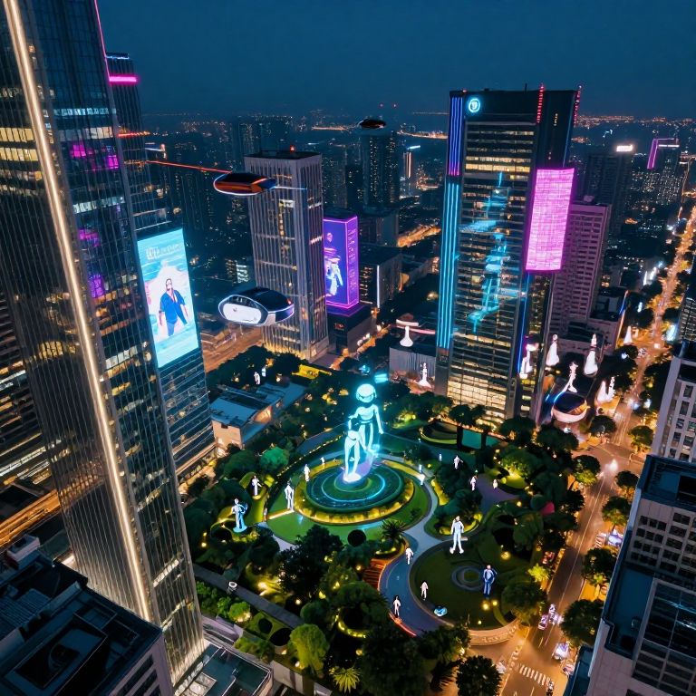 A cityscape of tomorrow unfolds from an aerial vantage point, where skyscrapers adorned with vibrant neon lights stand in harmonious contrast to tranquil gardens below. This fusion of cyberpunk and utopian visions presents holographic ads floating mid-air amidst coexisting humans and androids. Aerial vehicles navigate the night sky, casting dynamic reflections on glass structures. The scene is characterized by vivid hues that blend technological advancement with organic tranquility, sparking contemplation on humanity's growth in sync with nature's enduring fortitude.