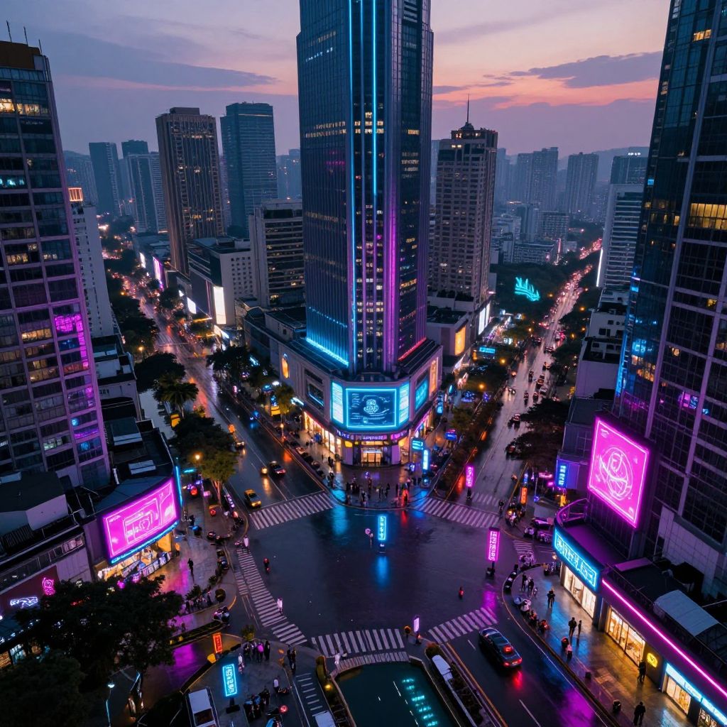 Nighttime aerial photograph of a neon-lit cityscape with illuminated skyscrapers, vibrant digital billboards, and a brightly lit circular park with statues