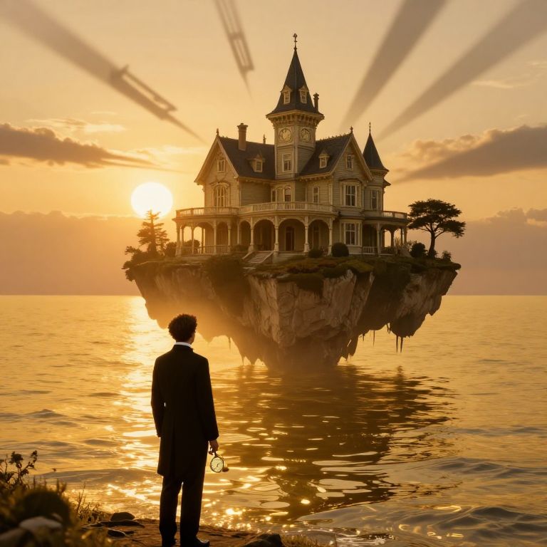A serene wooden cabin perches improbably atop a floating island suspended high above a tranquil beach, cascading turquoise waterfalls defying gravity as they ascend into the sky, creating a surreal bridge between earth and heavens.
