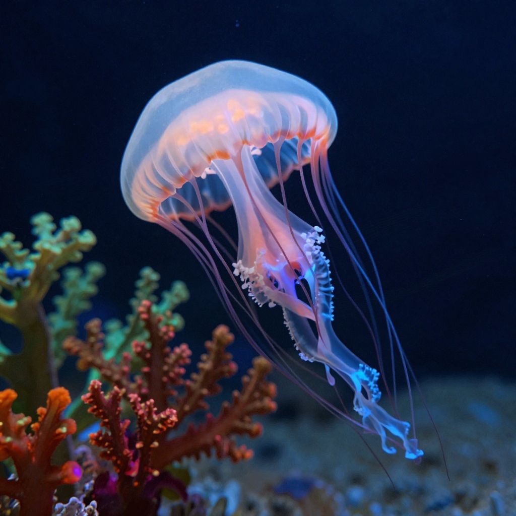 Photograph of a glowing, translucent jellyfish with blue and orange accents, floating above vibrant, colorful coral in a dark underwater scene.