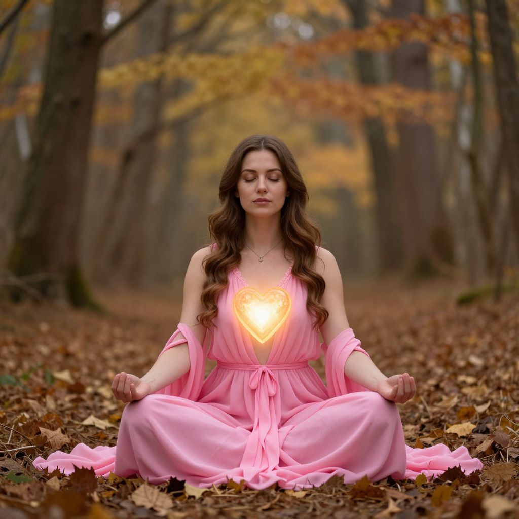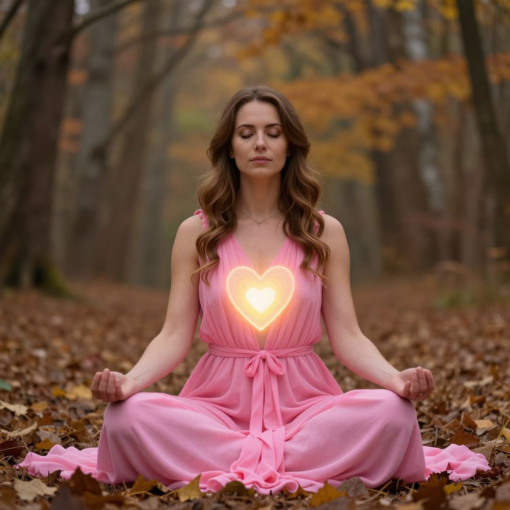 In a serene forest bathed in autumnal hues, a woman adorned in a radiant pink gown sits in meditative stillness, her heart aglow with a luminous warmth that symbolizes the transformative power of self-love and inner strength, inviting the viewer to embrace the eternal journey of healing and empowerment.