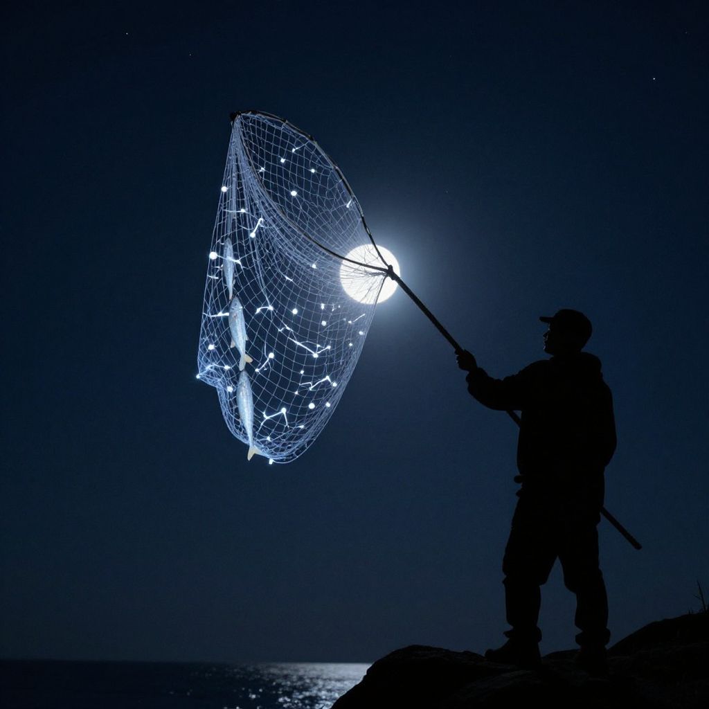 A fisherman stands silhouetted against a starry night sky, casting a glowing net illuminated by moonlight, as if reeling in constellations wrapped like fish in celestial nets made of ethereal light, captured in a high-definition, atmospheric digital art style.
