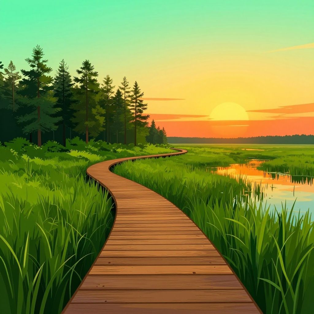 Illustration of a wooden boardwalk winding through lush green wetlands with tall trees on the horizon. The scene features bright sunset hues with a gradient sky transitioning from green to yellow to orange, and water reflecting vibrant colors. The image has a toon rendering style with exaggerated outlines and colors, emphasizing a calm and scenic natural environment during the evening.