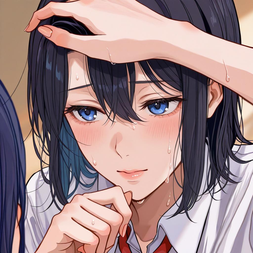 Adachi sakura, adachi to shimamura, 1girl, hair between eyes, blue eyes, black hair, blue hair, short hair, sweat, school uniform, white shirt, collared shirt, long sleeves, by artist revolverwing, illustrious