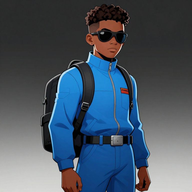 Opacity comic style of Jame Hewlett; a hi-tech, futuristic, African American teenaged boy wearing a two-tone blue jumpsuit, backpack and sunglasses,