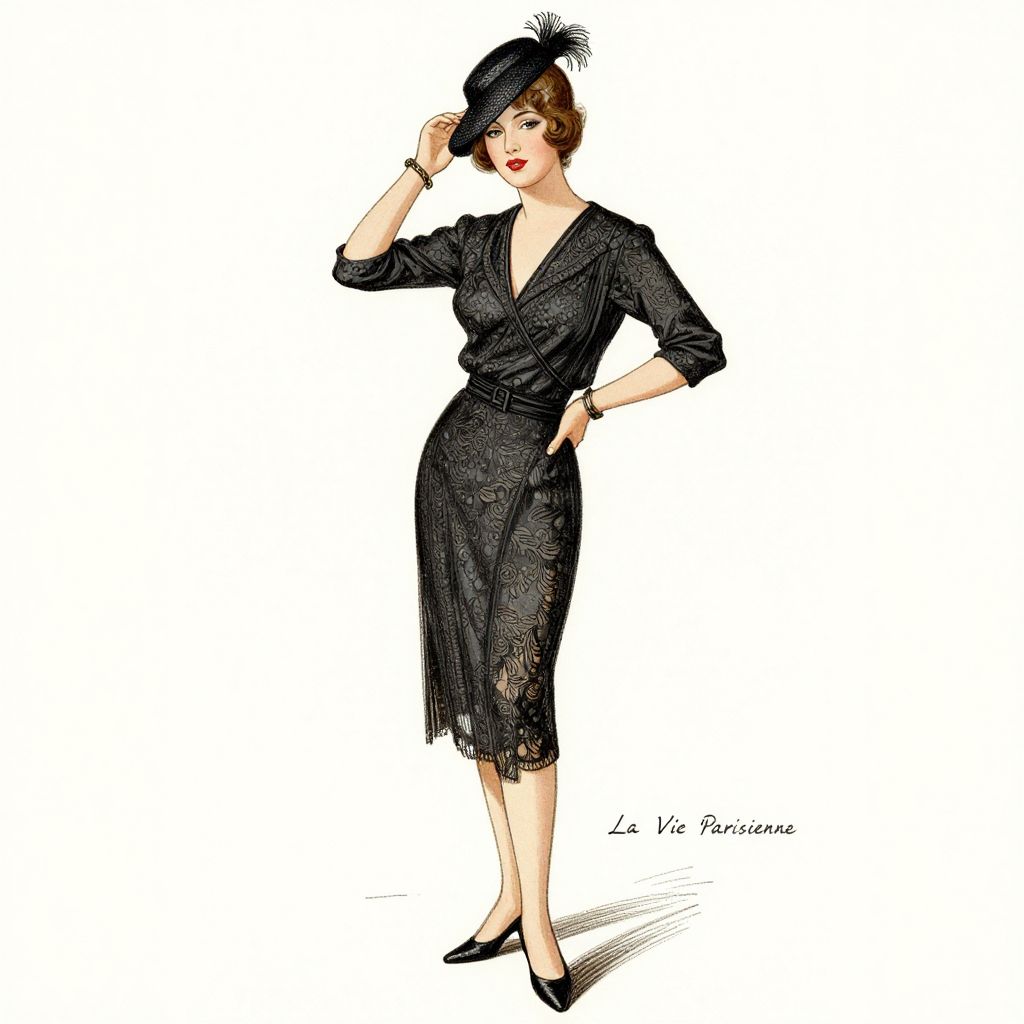 A vintage 1938 illustration featuring a stylish Parisian woman in a black ensemble, including a hat and heels, set against a clean, minimalist background, showcasing the classic elegance of \"La Vie Parisienne\" in a retro, hand-drawn style.