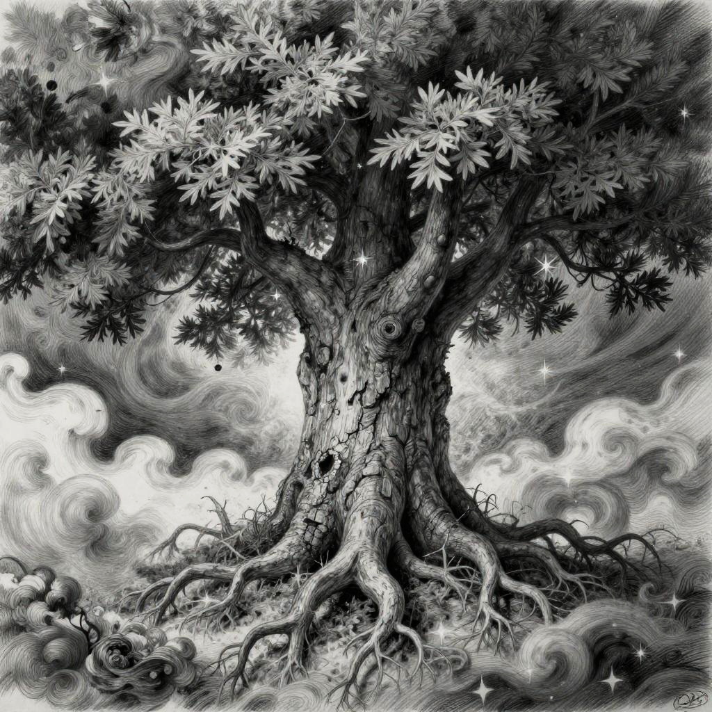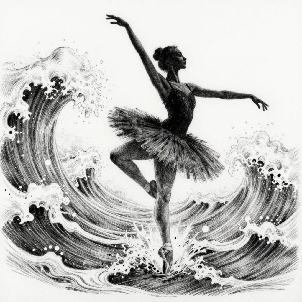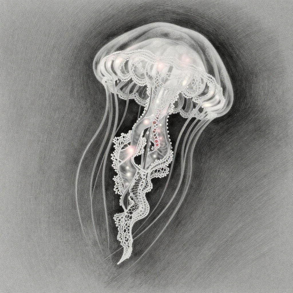 A surreal pencil drawing depicting a jellyfish with delicate lace tendrils. The artwork features transparent layering, intricate lace patterns, and soft glowing highlights, creating an elegant and otherworldly atmosphere. The drawing showcases detailed and imaginative artistry in monochrome shades.