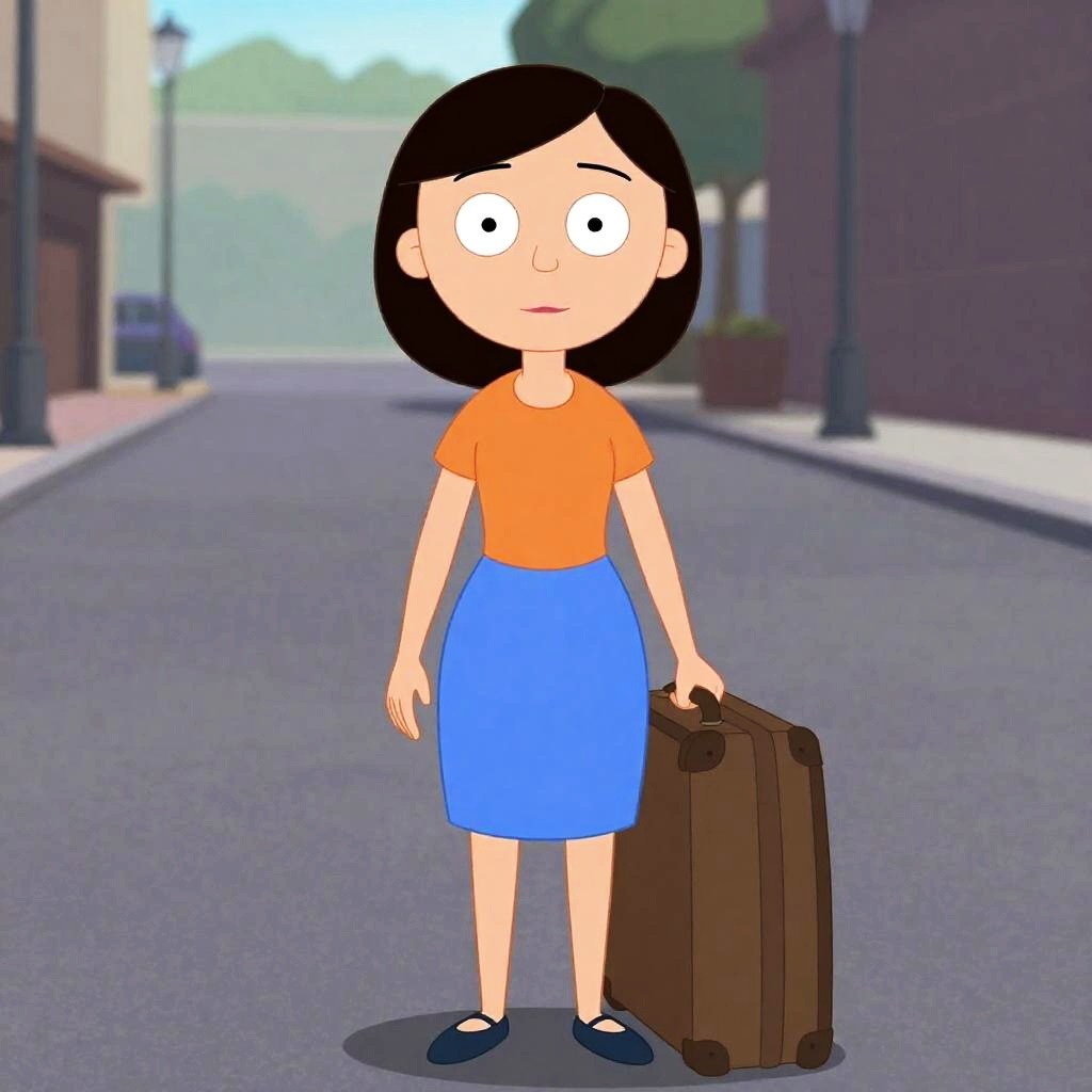 Phineas And Ferb Isabella, woman in orange and blue dress standing in a street with a suitcase