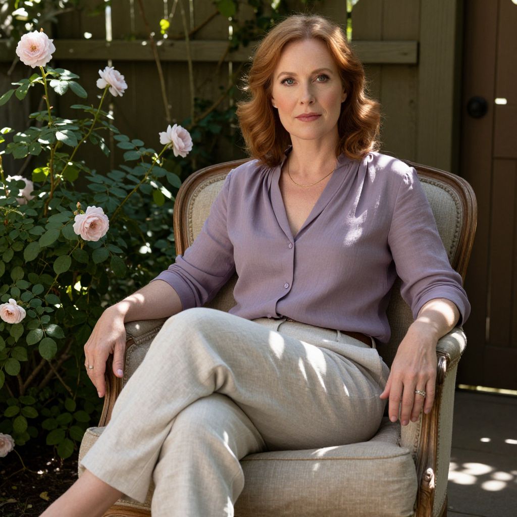 Photograph of a middle-aged woman with brown hair in a braid, wearing a patterned shirt, sitting at a wooden table with fruit, thinking