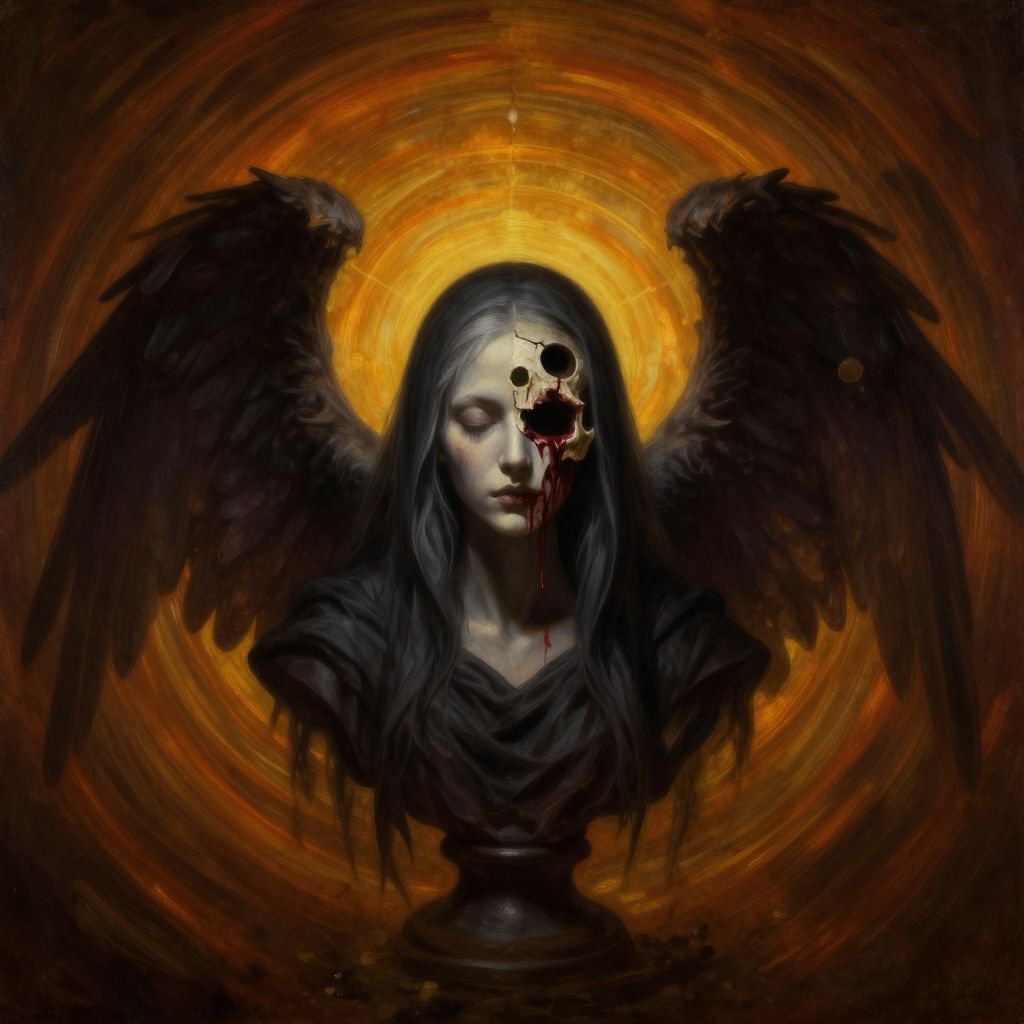 Digital artwork depicting a solemn, pale-skinned angelic woman with long, dark, flowing hair. She has large, black, feathered wings spreading from her back. Her left eye socket is open and empty, bleeding dark red blood, while her closed right eye is intact. She wears a dark, draped garment. The background features swirling, fiery orange and black hues, creating a halo effect around her head. The overall mood is dark and haunting, with a mix of gothic and surreal elements. The image has a high contrast and dramatic lighting, emphasizing her ethereal and tragic appearance.