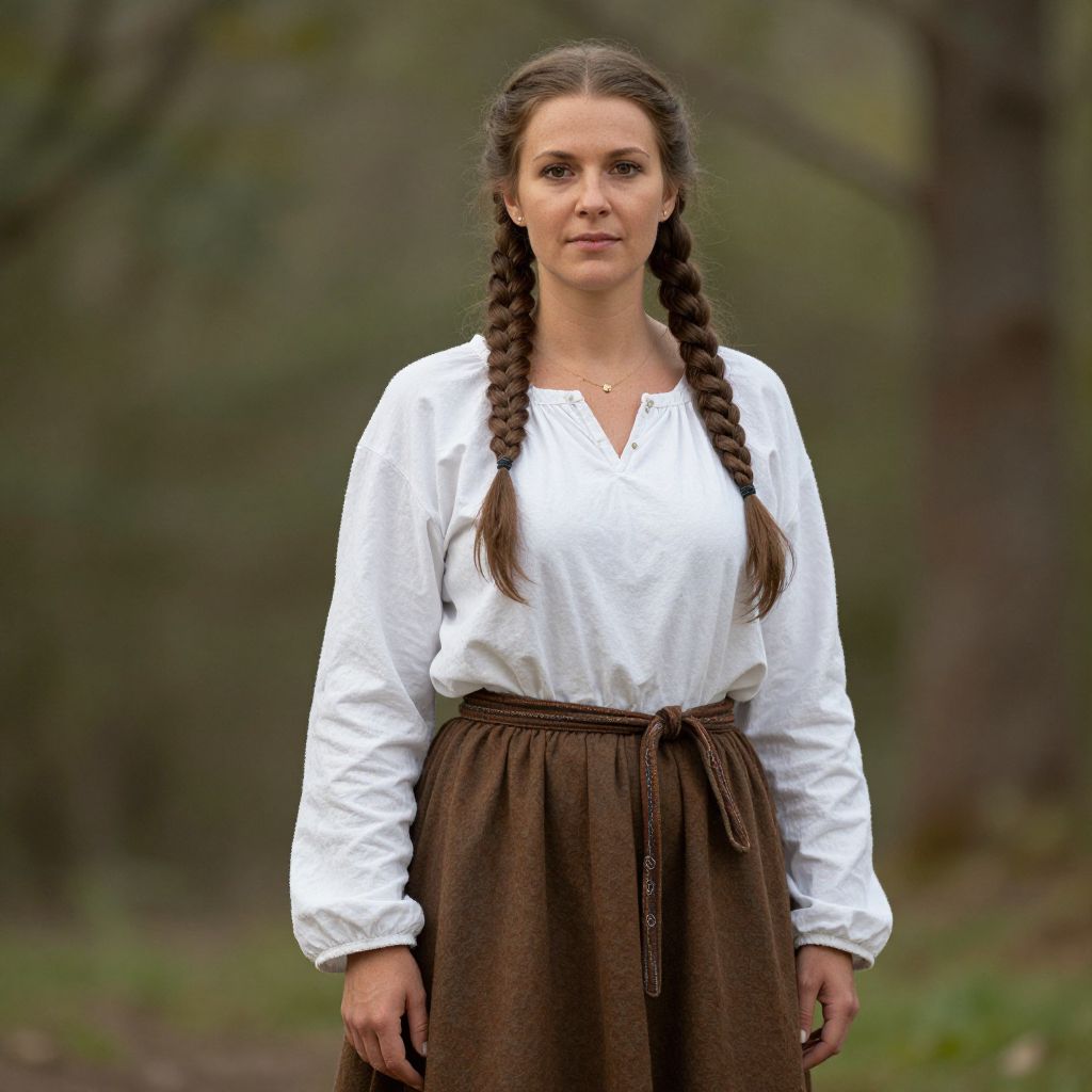 Photograph of a Caucasian woman with fair skin and long brown hair in two braids, standing outdoors in a forest. She wears a white, long-sleeved, peasant-style blouse with a V-neck and a brown, waist-belted skirt. The blouse is slightly loose, and the skirt has a textured, woven pattern. She has a neutral expression and stands with her hands by her sides. The background is blurred, showing green foliage and tree trunks, creating a natural, rustic setting. The lighting is natural, emphasizing the earthy tones of her outfit and the surrounding environment.