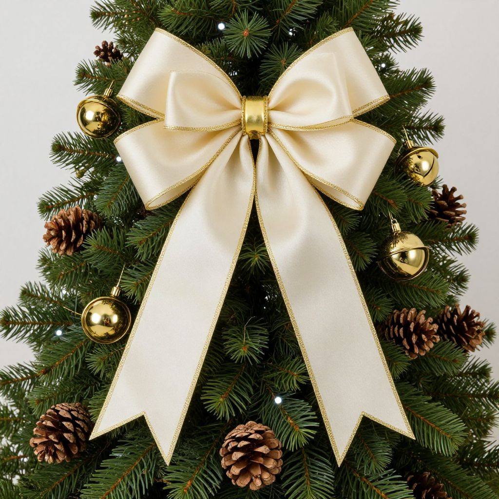 Photograph of a Christmas tree adorned with a large, cream-colored satin bow tied at the center. The bow features gold trim and cascades into two long, flowing tails. Surrounding the bow are shiny gold baubles and brown pinecones interspersed among the dark green pine needles. The background is a plain white, highlighting the festive decorations on the tree. The image captures the textures of the satin bow, shiny baubles, and pinecones against the natural pine needles, creating a classic, elegant holiday scene.