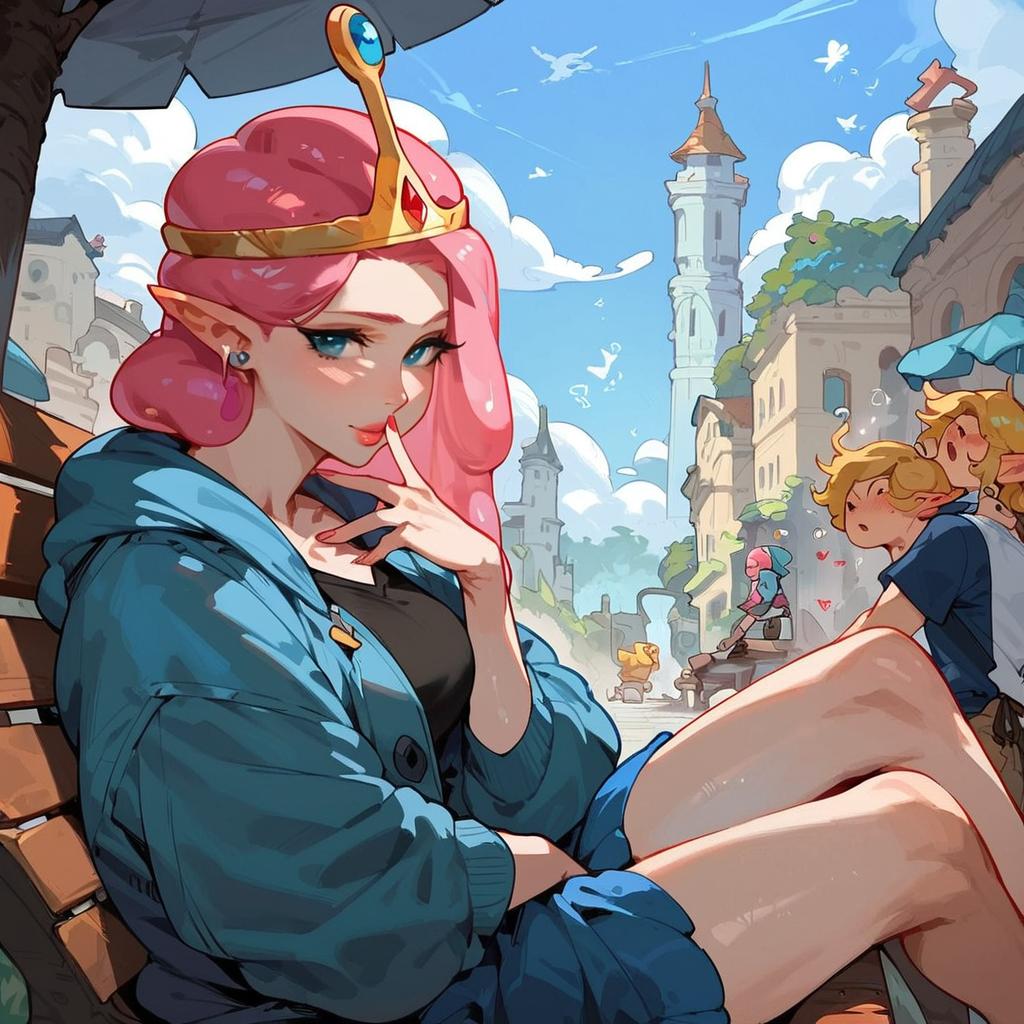 Score_9, score_8_up, score_7_up, score_6_up, score_5_up, score_4_up, adventure time screencap, princess bubblegum in techwear jacket and leggins, sitting on bench, city street, looking at viewer