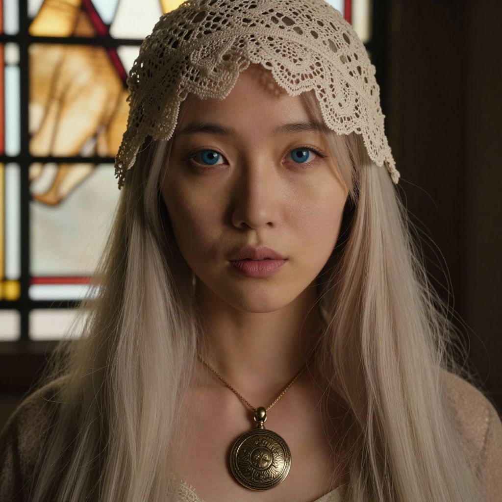 Close-up photorealistic portrait of an enigmatic East Asian woman with striking blue eyes, pale skin, and long platinum blonde hair. She wears a delicate beige lace caplet on her head and an antique gold locket with intricate sun patterns on a chain around her neck. Soft golden light filters through a stained glass window in the background, casting subtle shadows on her serene facial features.