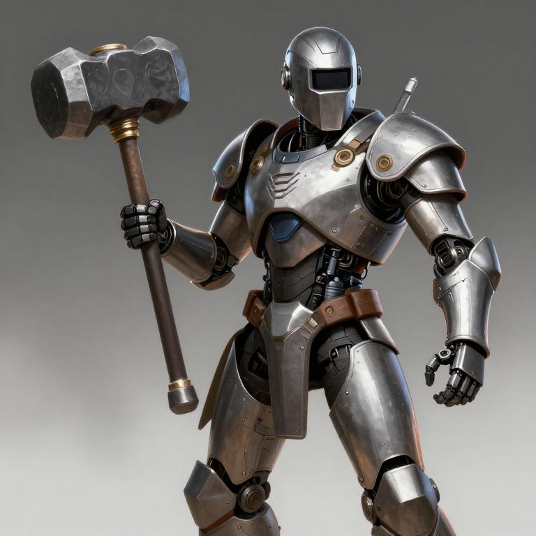 Photorealistic CGI of a silver, armored robot warrior with a helmet, holding a large, metallic hammer, standing against a gradient gray background.
