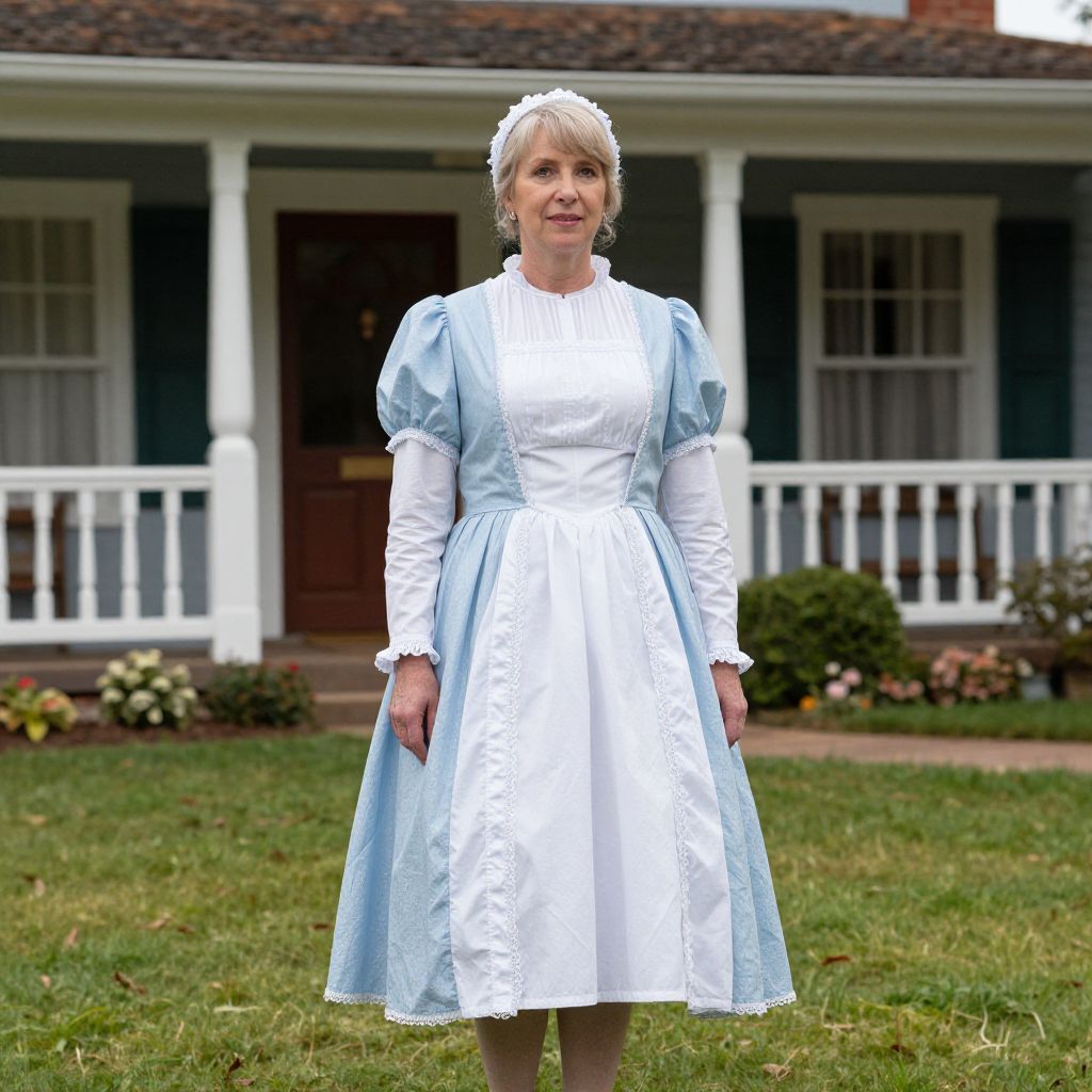 Photograph of an older woman standing in front of a white-painted, blue-trimmed house with a porch and brown door. She wears a vintage-style, light blue and white dress with puffed sleeves, white cuffs, and a white apron-like front. Her blonde hair is neatly pulled back with a white hairnet. The grassy lawn is visible in the foreground, with small bushes and flowers along the house's base. The woman's expression is neutral, and she stands centered in the frame. The house has white railings and dark brown roof shingles.