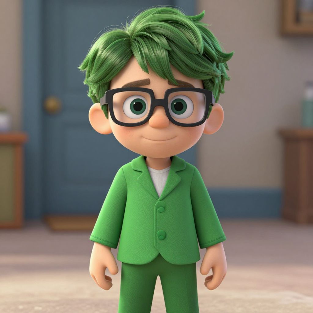 The Riddler Costume Boy, boy with green hair and glasses wearing a green suit