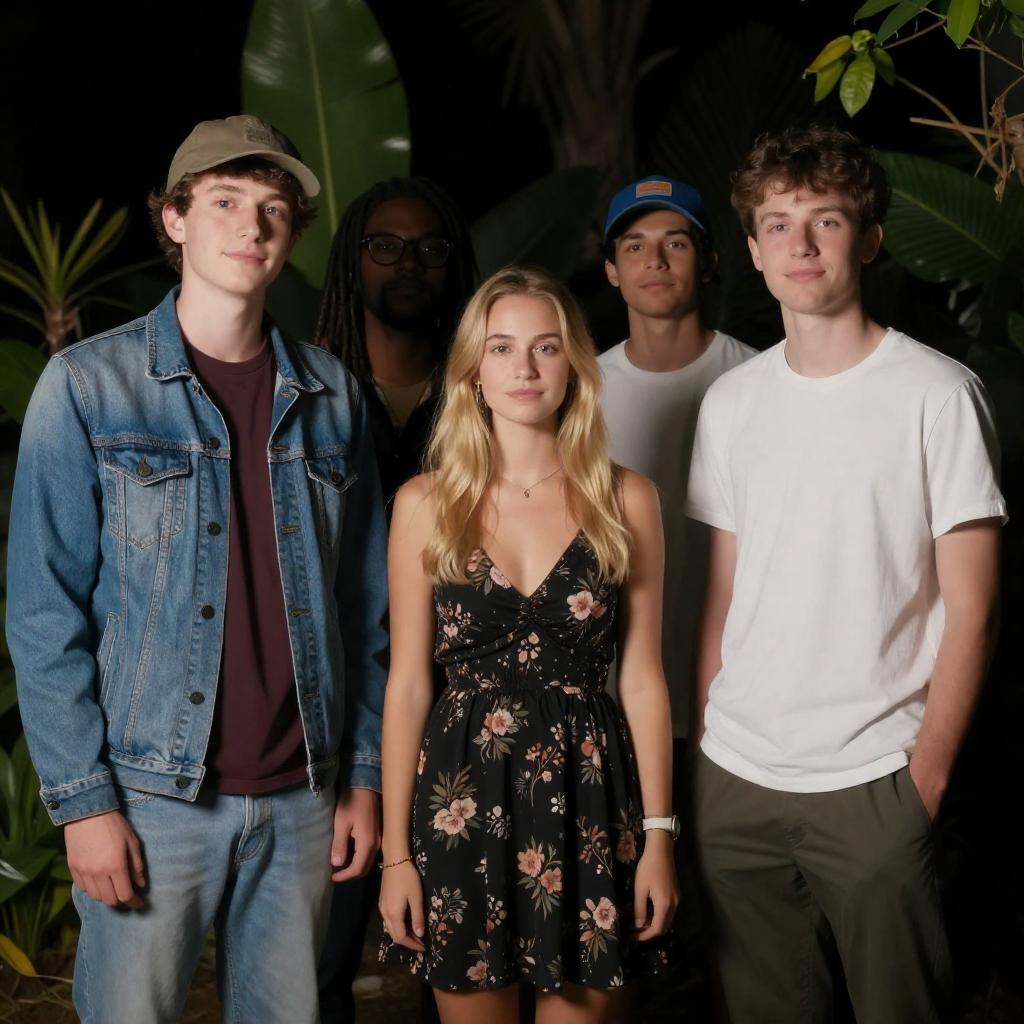 Photograph of five young adults standing in a dimly lit, greenery-filled area. A blonde woman in a black floral dress is centered, surrounded by four men in casual clothing: one in a denim jacket and hat, one with dreadlocks, one in a white t-shirt and blue cap, and one in a white t-shirt. They smile at the camera, with soft light highlighting their faces and the foliage around them.
