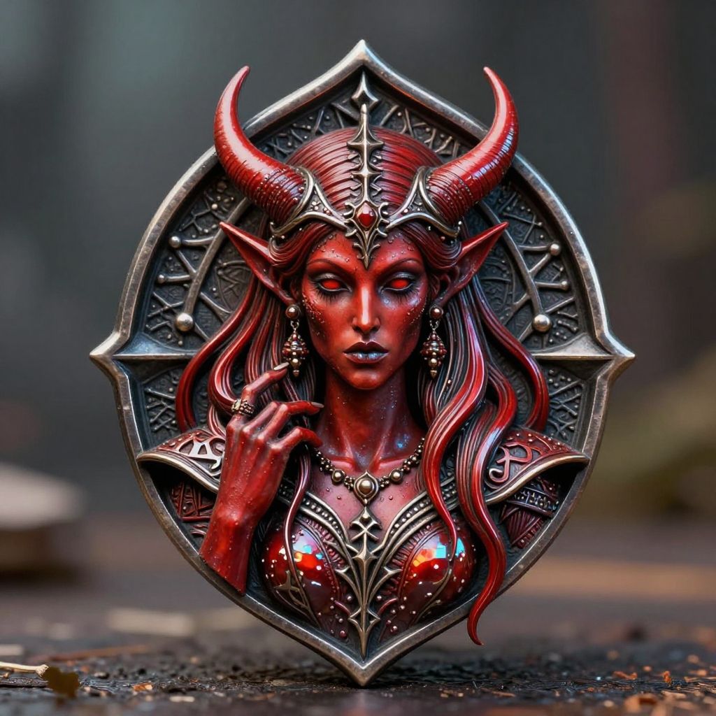 This is a highly detailed digital artwork of a red-skinned, demonic female figure with long, wavy red hair, and large curved horns. Her eyes are closed and her expression is serene. She wears intricate silver armor with ornate patterns and a necklace with a central gem. Her right hand is raised, with fingers slightly curled. The background is blurred with dark, moody colors, drawing focus to the figure. The overall style is fantasy with a gothic and metallic aesthetic, and the image has a high-contrast, almost hyper-realistic quality. The figure is centered within a silver, shield-like frame.