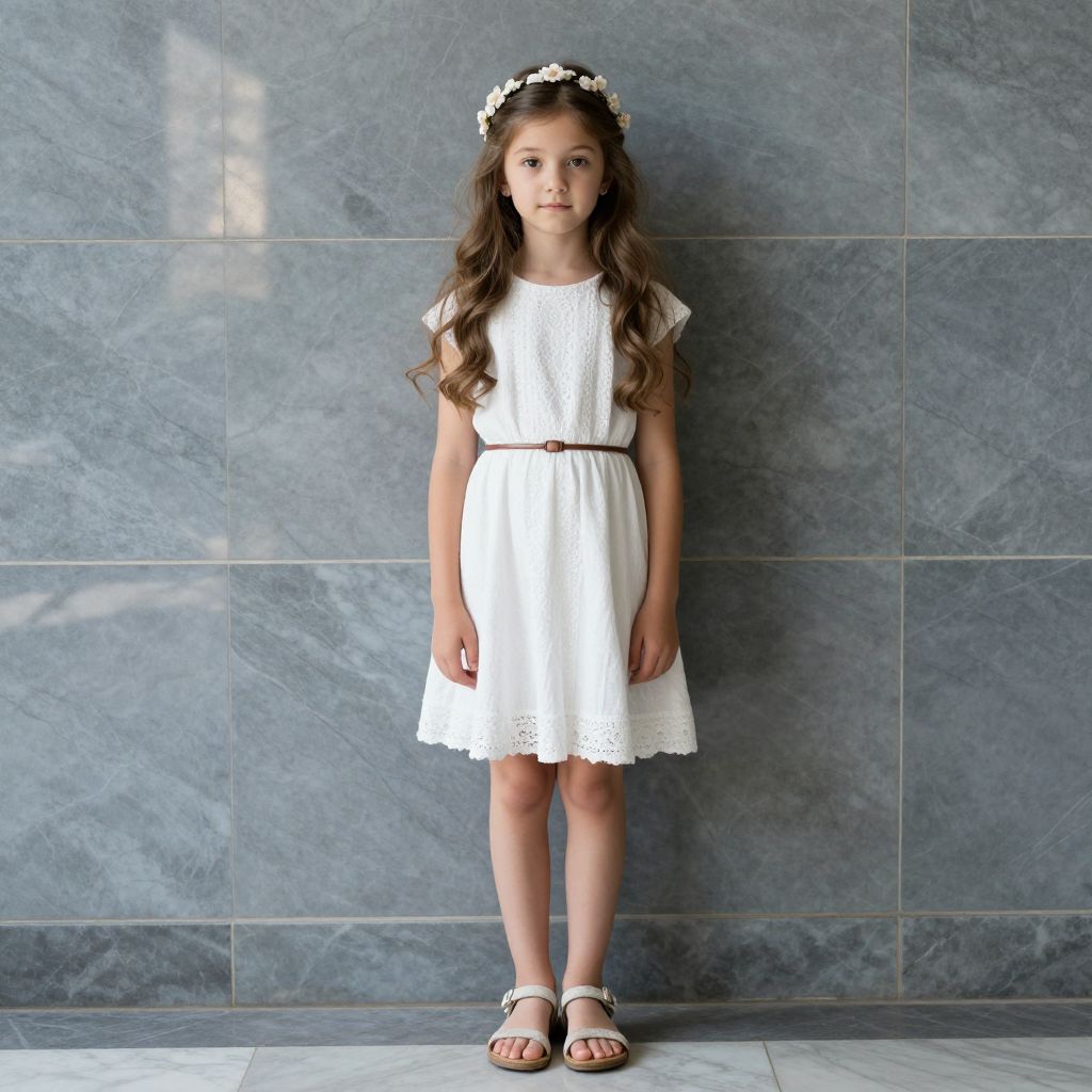 A young girl with brown hair, soft and flowing, is wearing a white dress with a hood that gently falls over her shoulders and a brown belt that accents her waist. She stands confidently on a cool, weathered stone floor, the surface slightly textured with moss and faint shadows, casting soft light across her silhouette. The scene is quiet and serene, with a subtle sense of warmth in the atmosphere, as if she's standing in an ancient courtyard or a peaceful forest clearing.