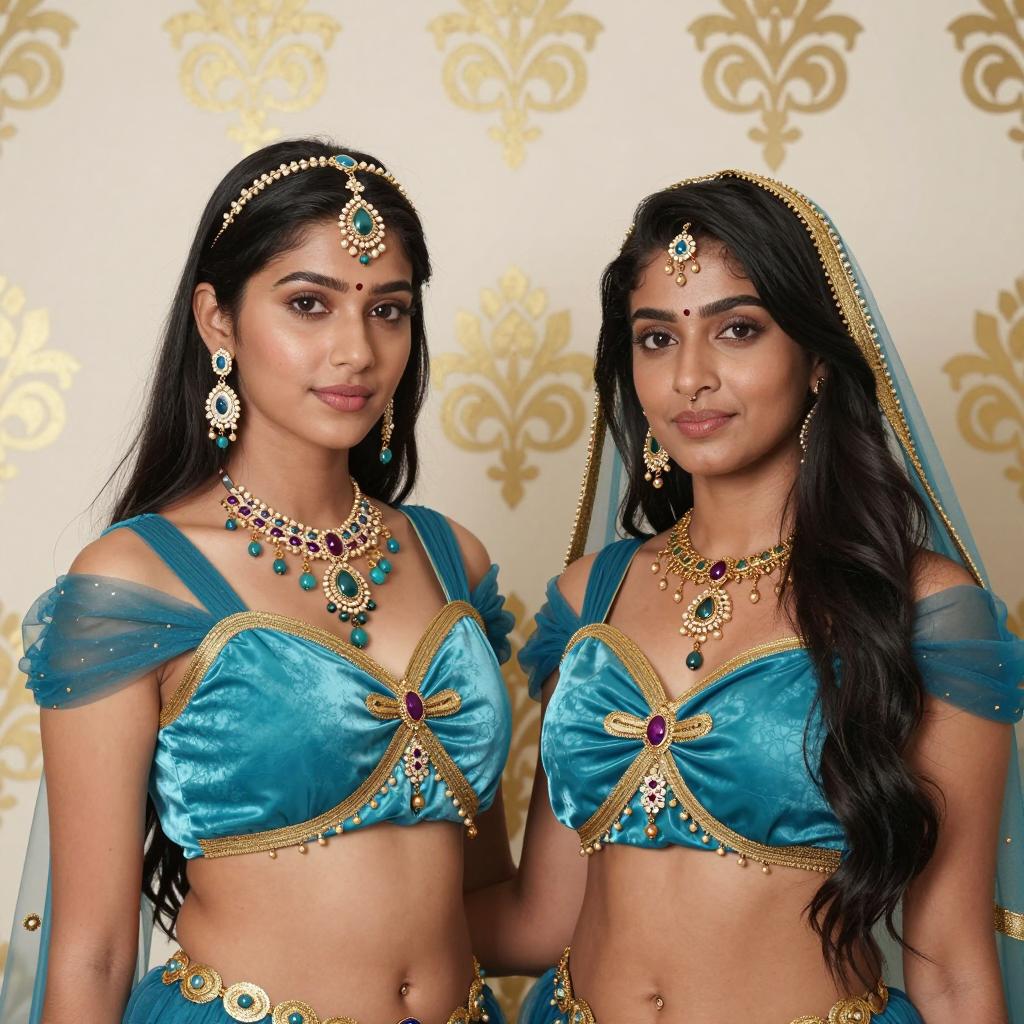 Portrait of two women wearing blue Jasmine-inspired costumes with gold accents, ornate jewelry including necklaces, earrings, and tiaras. They have long black hair and are posing against a decorative gold and cream patterned background.