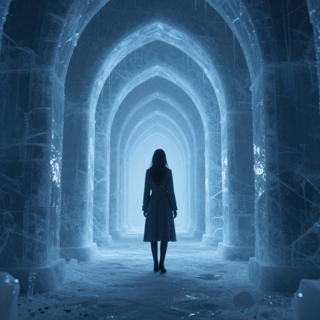 A hauntingly surreal 3D-rendered corridor of icy archways, illuminated by ethereal blue light, captures the solitary figure of a woman in a long coat, her silhouette fading into the distance as if caught in a labyrinth of frozen whispers, evoking the eerie echoes of past selves.