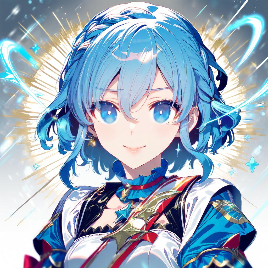 Digital illustration of a young anime girl with short blue hair styled with a side braid. She has bright blue eyes and wears a detailed outfit featuring blue, white, red, and gold colors. The background includes glowing and sparkling elements surrounding her, creating a magical and ethereal atmosphere. The art style is vibrant and polished, inspired by artist Zounose and Animagine.