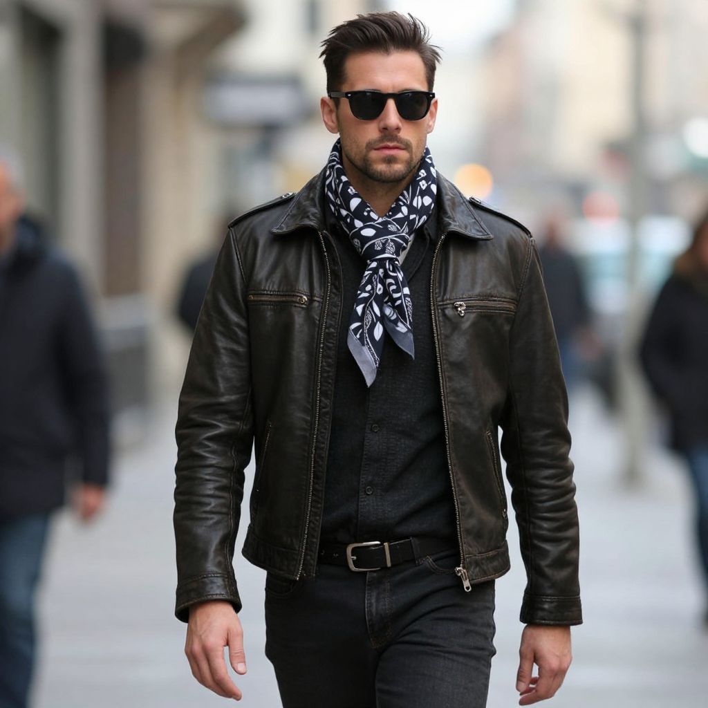 Trendy Man Costume, man in a leather jacket and scarf walking down a street