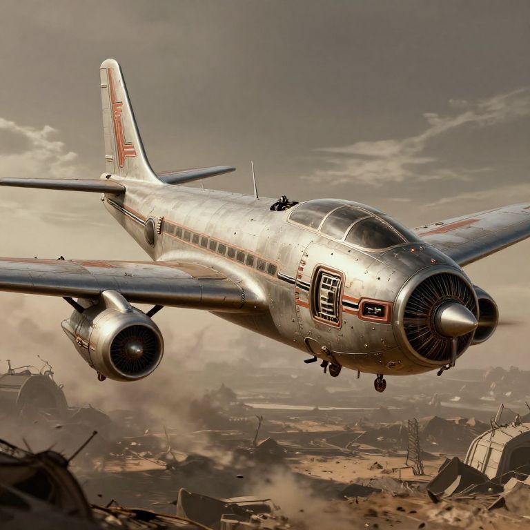 Photorealistic digital artwork of a silver, vintage jet aircraft with "EA" and red stripes on the fuselage, flying low over a war-torn, desolate landscape. The plane's nose and engines are prominently detailed, with its landing gear partially extended. The background features a cloudy, gray sky and debris-strewn ground, including destroyed buildings and twisted metal. The aircraft's shiny, reflective surface contrasts with the muted, chaotic environment below. The overall tone is dramatic, emphasizing the plane's dominance against the ravaged background.