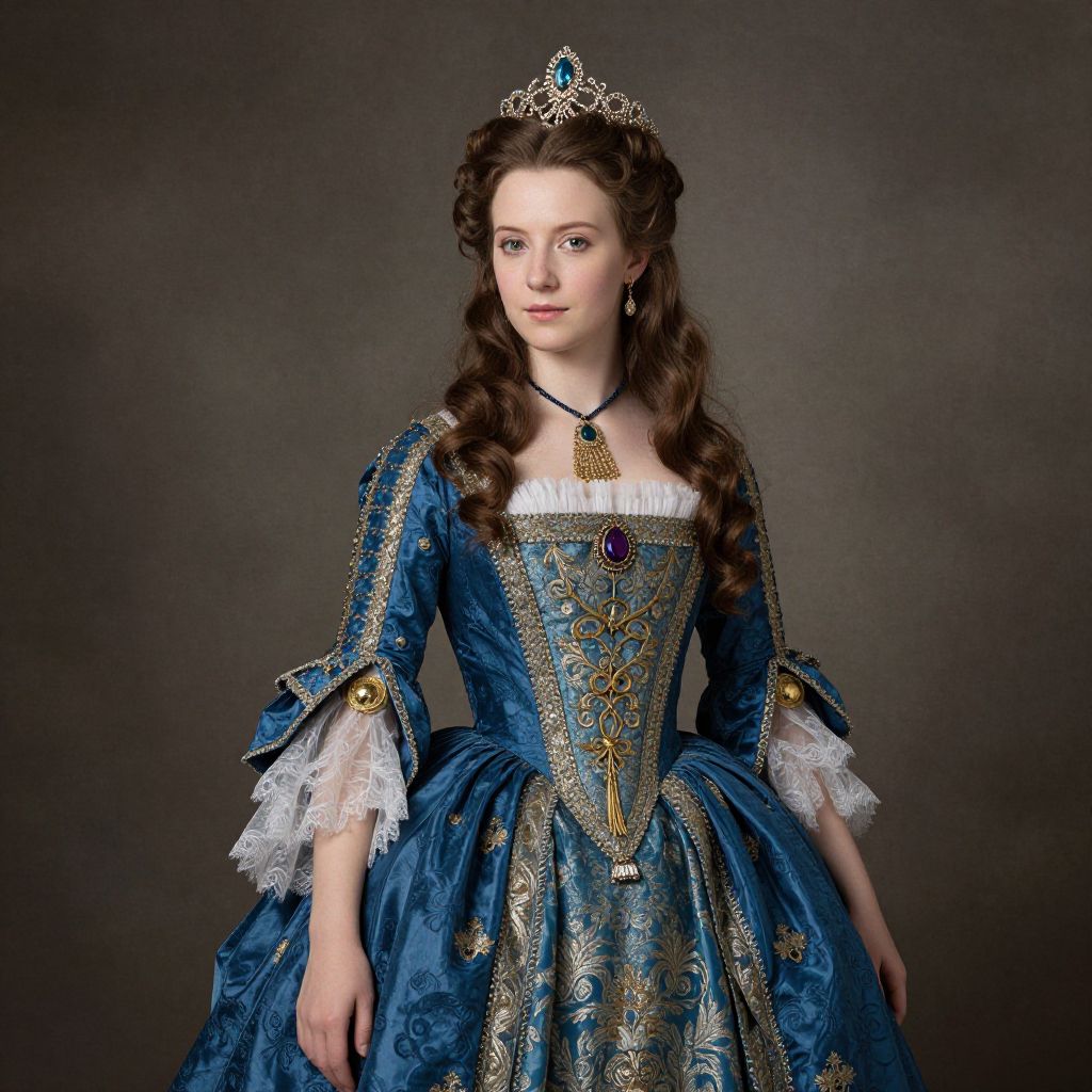 This captivating image features a stunning young woman styled as an elegant 1600s English princess. Adorned in a rich blue gown with intricate details and regal accessories, she exudes a sense of nobility and grace, perfectly capturing the artistry of historical portraiture.