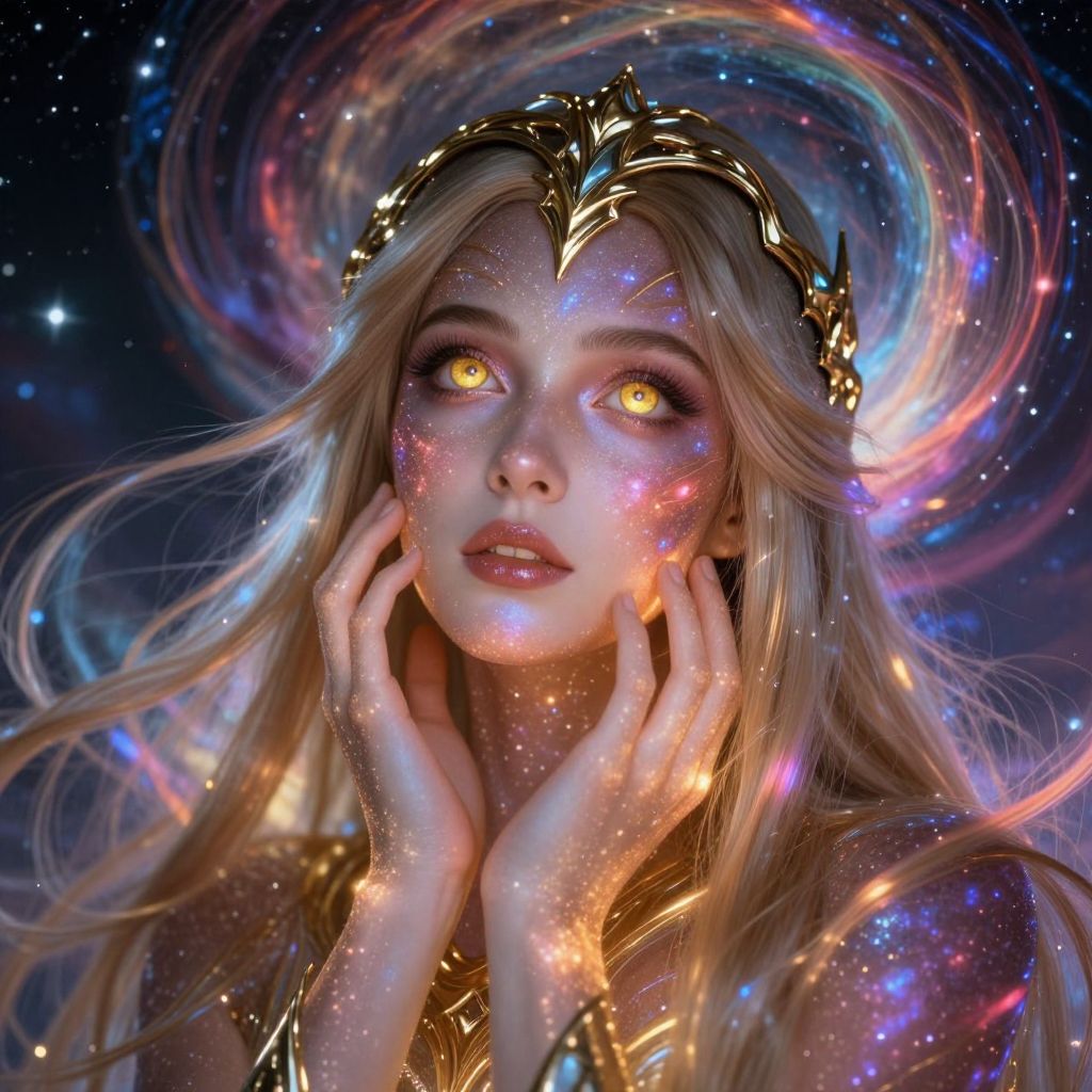 This digital artwork depicts a beautiful, ethereal woman with glowing, golden-yellow eyes and long, flowing blonde hair. Her skin is adorned with sparkling, colorful star-like patterns. She wears a golden, ornate crown and her hands gently touch her face, displaying delicate fingers. The background is a cosmic expanse with swirling, multicolored nebulae and stars. Her expression is serene yet mystical, and her golden armor-like garment glimmers with light. The overall style is highly detailed, with a fantasy, otherworldly aesthetic, blending elements of cosmic art and digital painting.