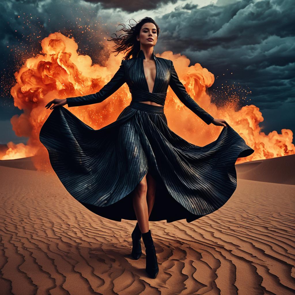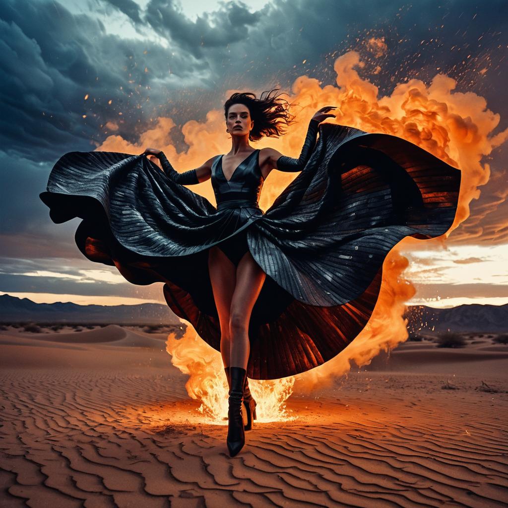 Dramatic high-fashion portrait of a striking female model wearing textured black leather outfit and high-heeled boots, posing confidently in a stormy desert at dusk. The scene features swirling sand clouds, glowing embers, and a large bonfire in the background under a moody, cloudy sky. Cinematic lighting emphasizes the dynamic motion of the flowing skirt and wind-blown hair, capturing a powerful and intense atmosphere.
