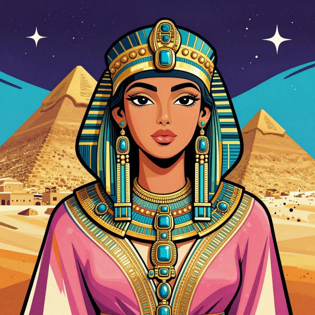 This vibrant illustration features a woman adorned in traditional Egyptian-inspired jewelry and attire, set against a stylized backdrop of pyramids and a celestial sky. The rich colors and bold outlines reflect a pop art style, evoking a sense of glamour and historical resonance.