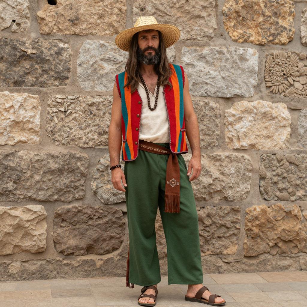 Man hippy costume, photorealistic, middle-aged man, long brown hair, beard, mustache, wearing straw hat, colorful striped vest, red and orange accents, green pants, brown belt with decorative sash, fringed bottom, brown sandals, standing in front of stone wall, daytime, outdoor, realistic ures, casual style, ethnic attire, full body, front view