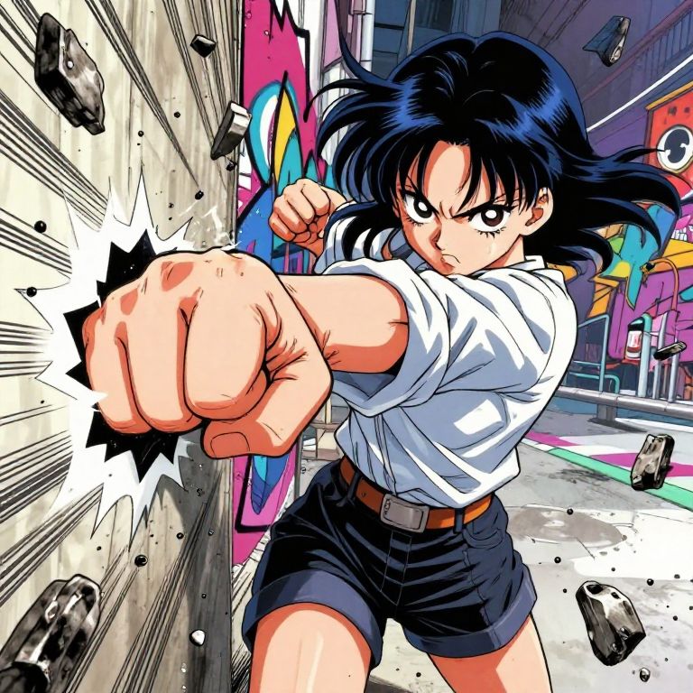 Anime girl punching through a wall, debris flying everywhere, dramatic lighting highlighting her strength, focused eyes and determined look, colorful manga style with exaggerated motion lines, urban environment background with graffiti art.
