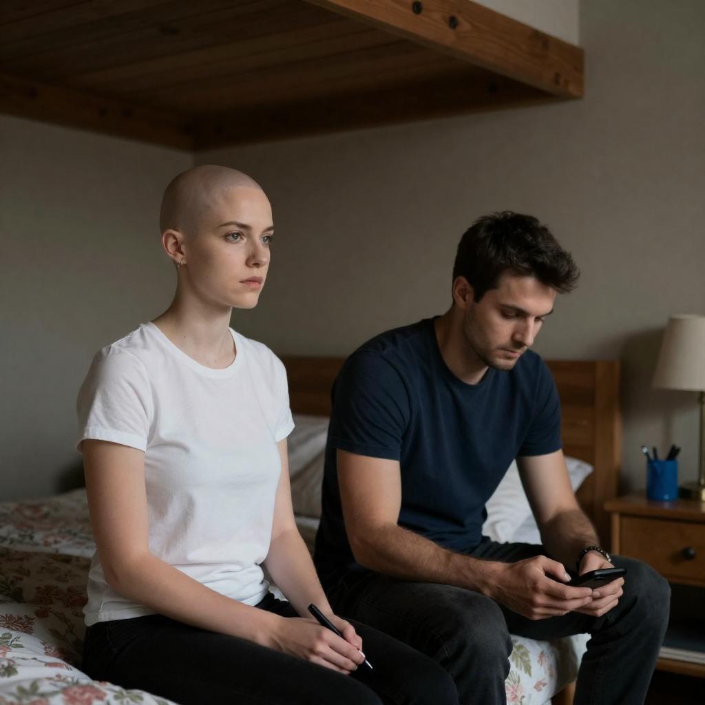 Photograph of a bald, pale-skinned boy with a serious expression, wearing a black sleeveless shirt, sitting on a bed. His focus is on a woman with curly brown hair in the foreground. Background includes a wooden chair, a shelf with books, and an alarm clock.