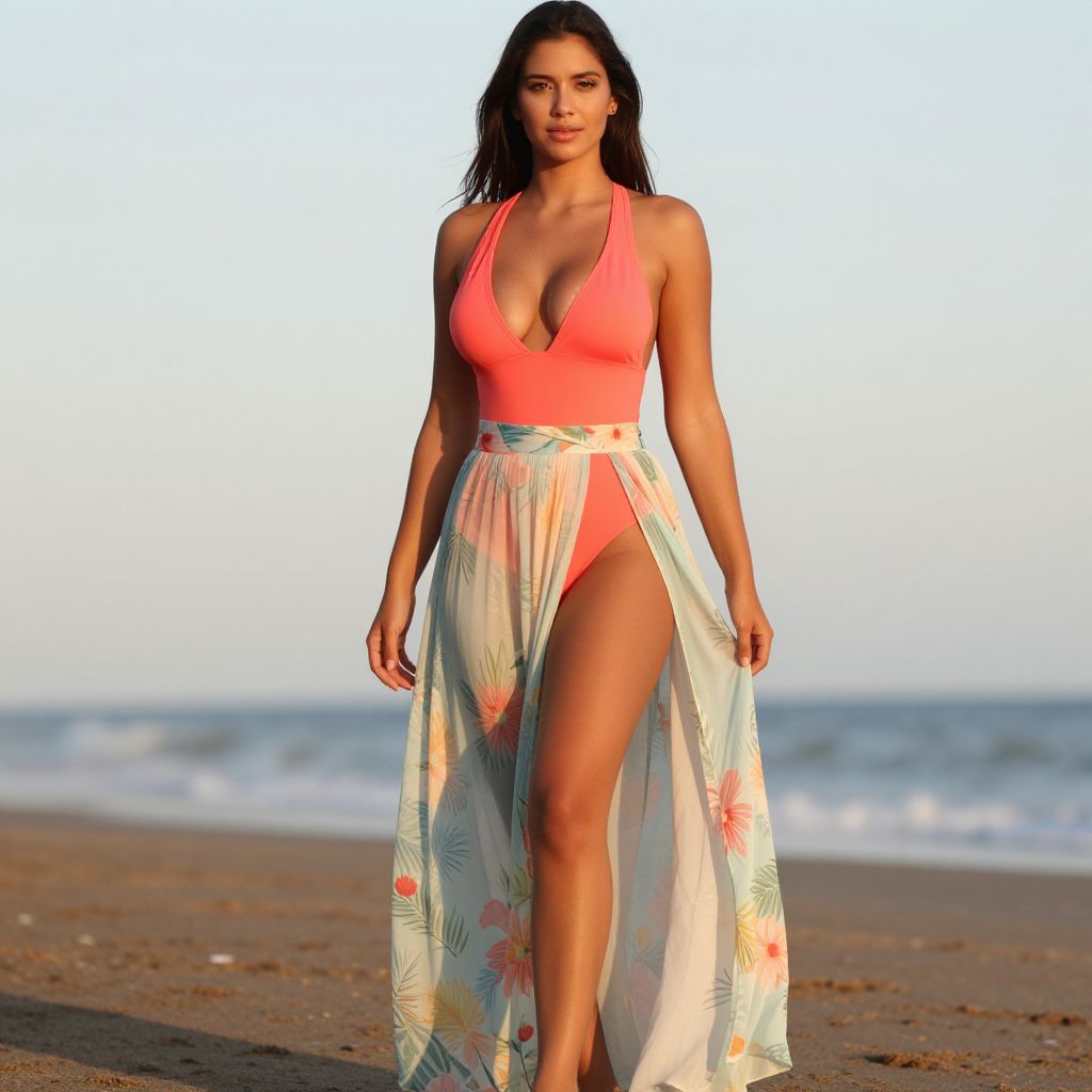 Full body shot, woman, high-cut swimsuit, vibrant coral color, sleek, stretchy nylon fabric, plunging neckline, low back design, adjustable straps, matching beach skirt, lightweight chiffon, flowing, ankle-length, high slit, tropical floral print, soft pastel hues, wide waistband, relaxed fit, sun-kissed skin, beach setting, golden hour lighting Sexy. Pretty face and beаutiful eyes. Big breasts